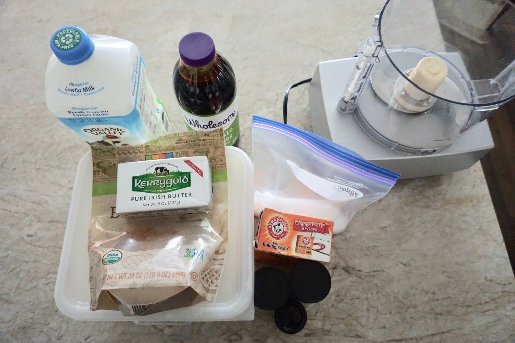 I got my measuring cup ready for pouring in my molasses. I sprayed it first with baking spray to make it easier for the molasses to pour out. This is the first time I have tried this trick and was actually really amazed at how well it worked! Then I measured out my 2 tablespoons of milk and added it to the molasses and poured it all over the sandy mixture while the machine was running. I knew it was finished when it all came together and started moving around the bowl of the food processor in a big clump.