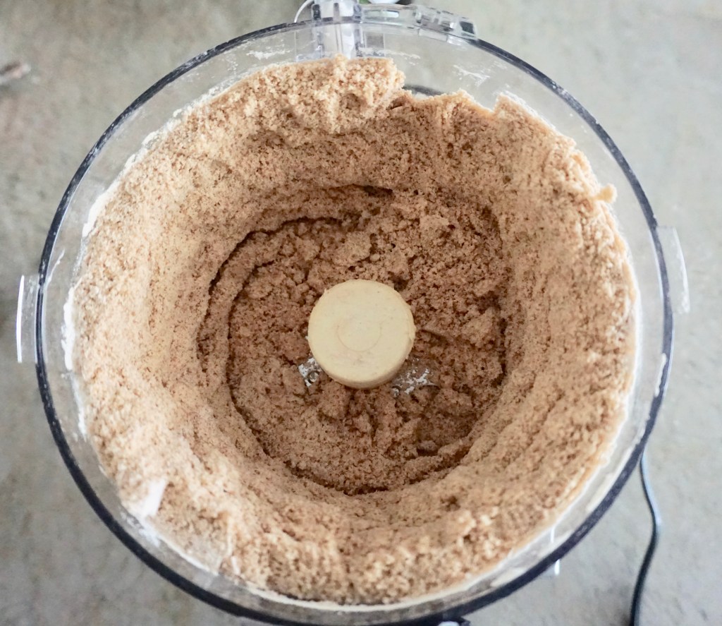 The first thing I did was add all the dry ingredients to the food processor, including the brown sugar. I let the machine run for about 10 seconds, until all the dry ingredients were mixed. Next, I cut up my 12 tablespoons of room temperature butter into chunks and added it to the food processor. I let the machine run again for about 10-15 seconds until the mixture resembled damp sand that stuck together if you squeezed it.