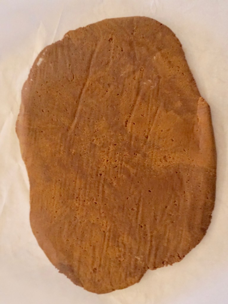 - Dump out half the dough on a piece of parchment paper and cover with a second sheet. Roll out the dough to 1/4 inch thickness. Don’t roll it too thin (especially the edges)