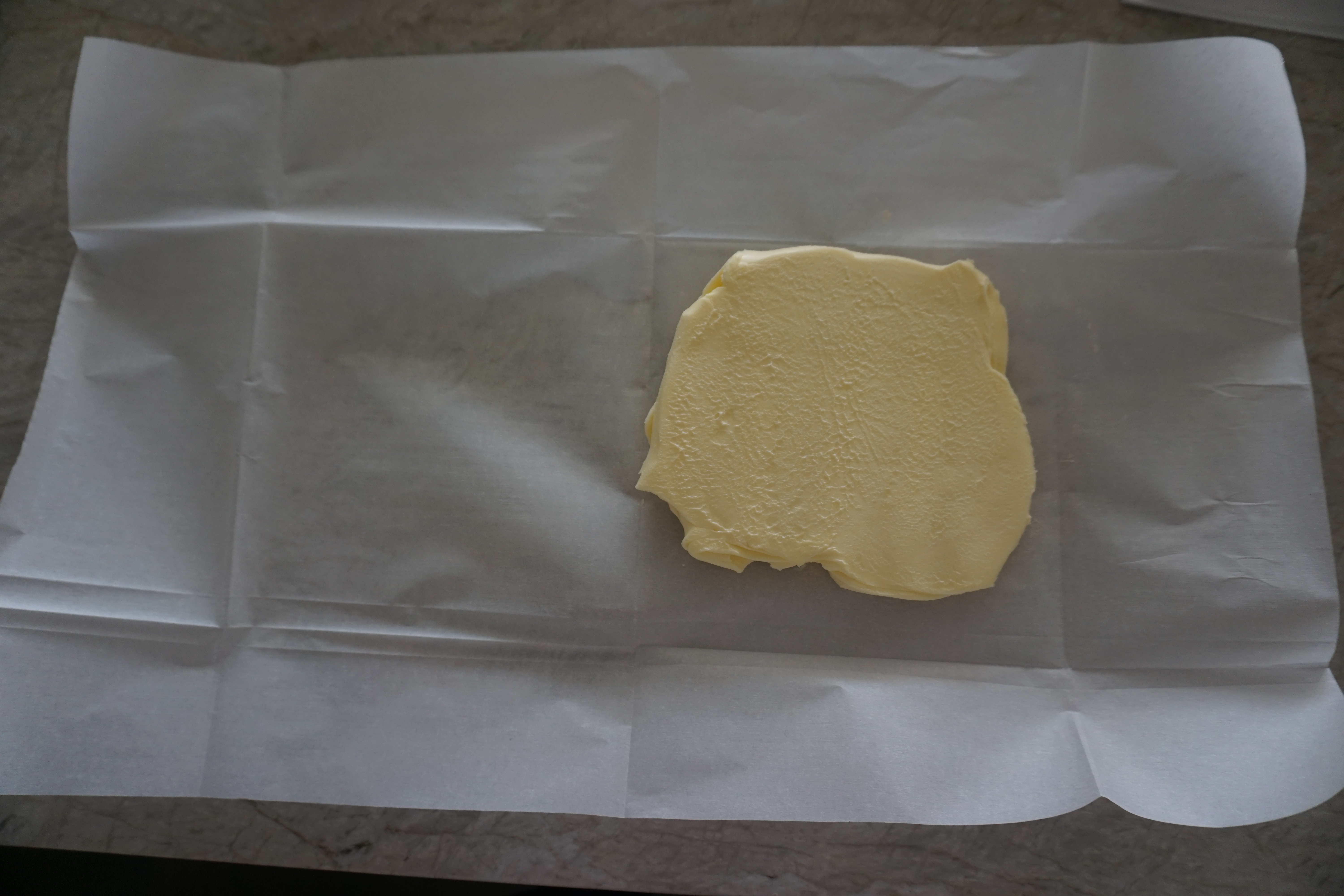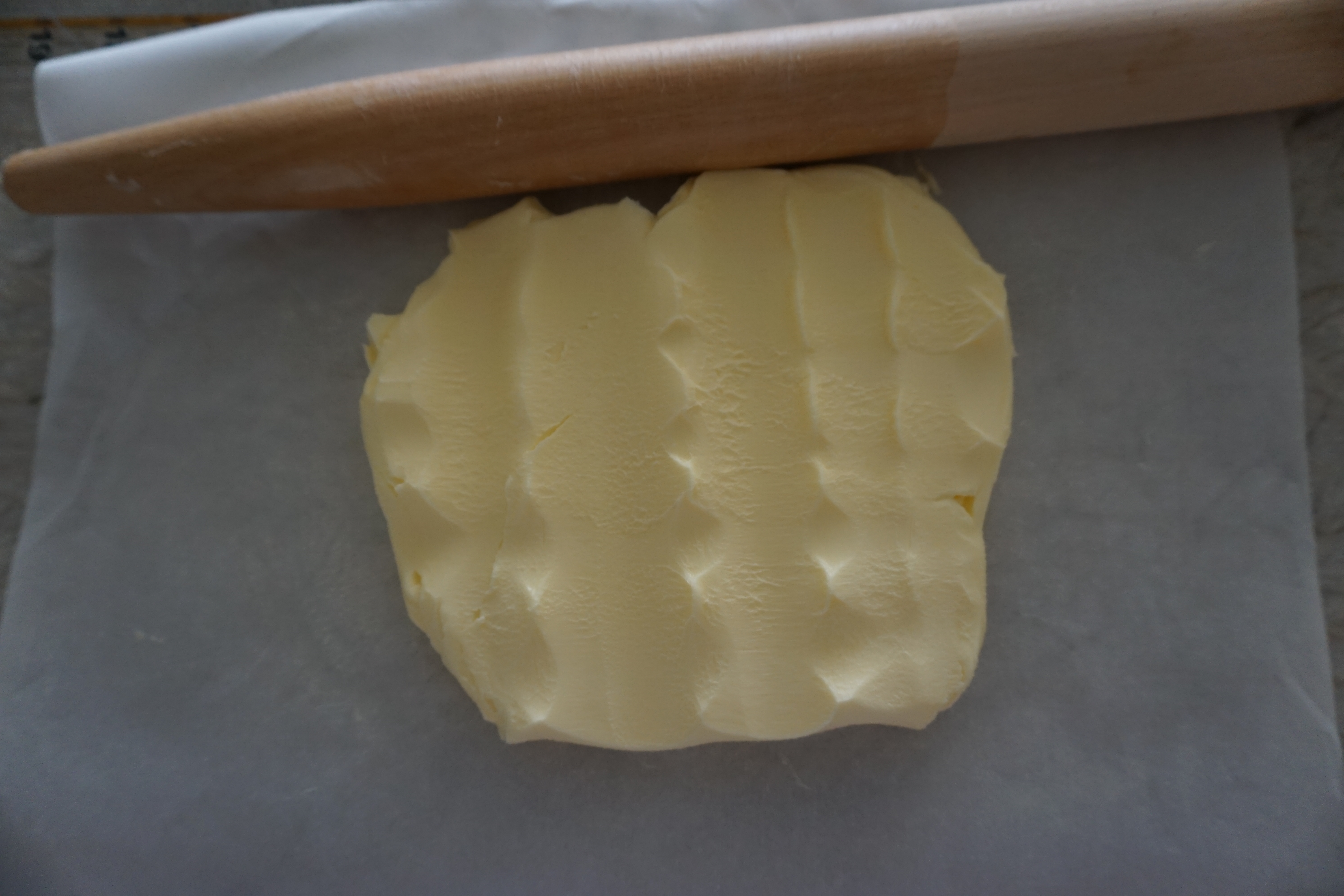 - Put 24 tablespoons of cold butter on a piece of parchment paper and using your rolling pin, beat the butter into a cohesive mass. You may need to use your parchment paper to help you fold the butter back on itself a few times until it is pliable.