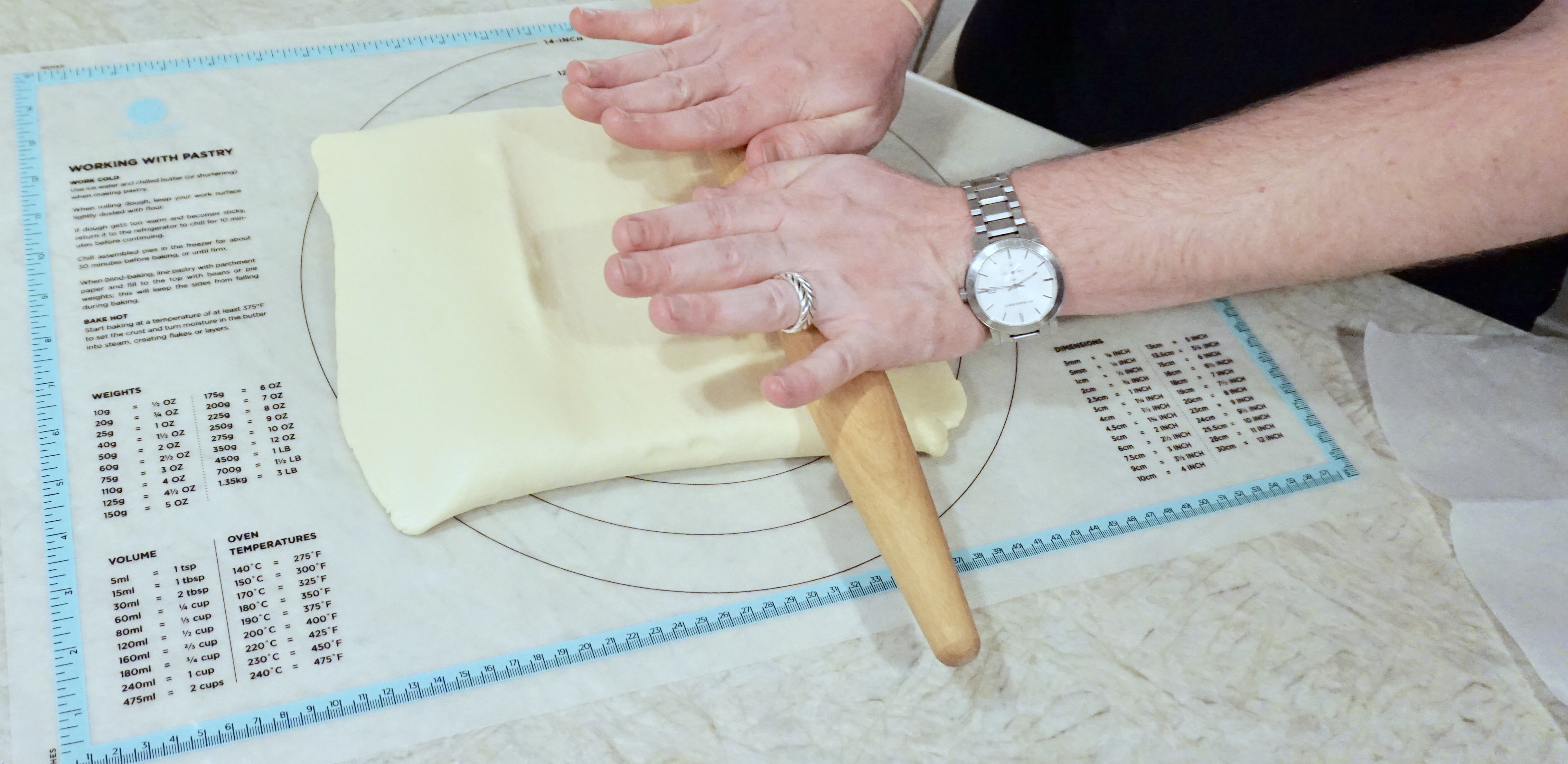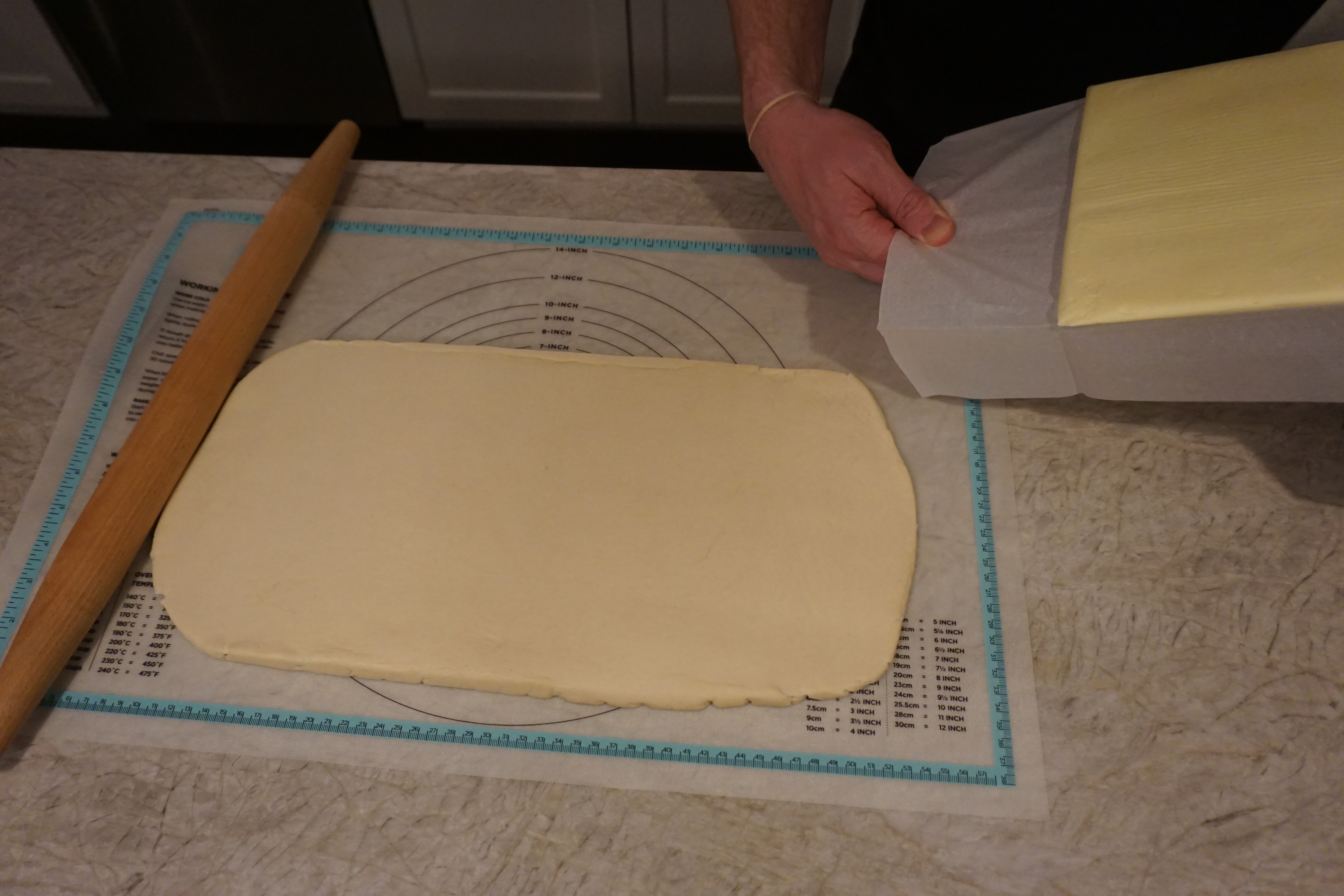 - Roll the dough out to a 24-by-8-inch rectangle begin careful that no butter is exposed.