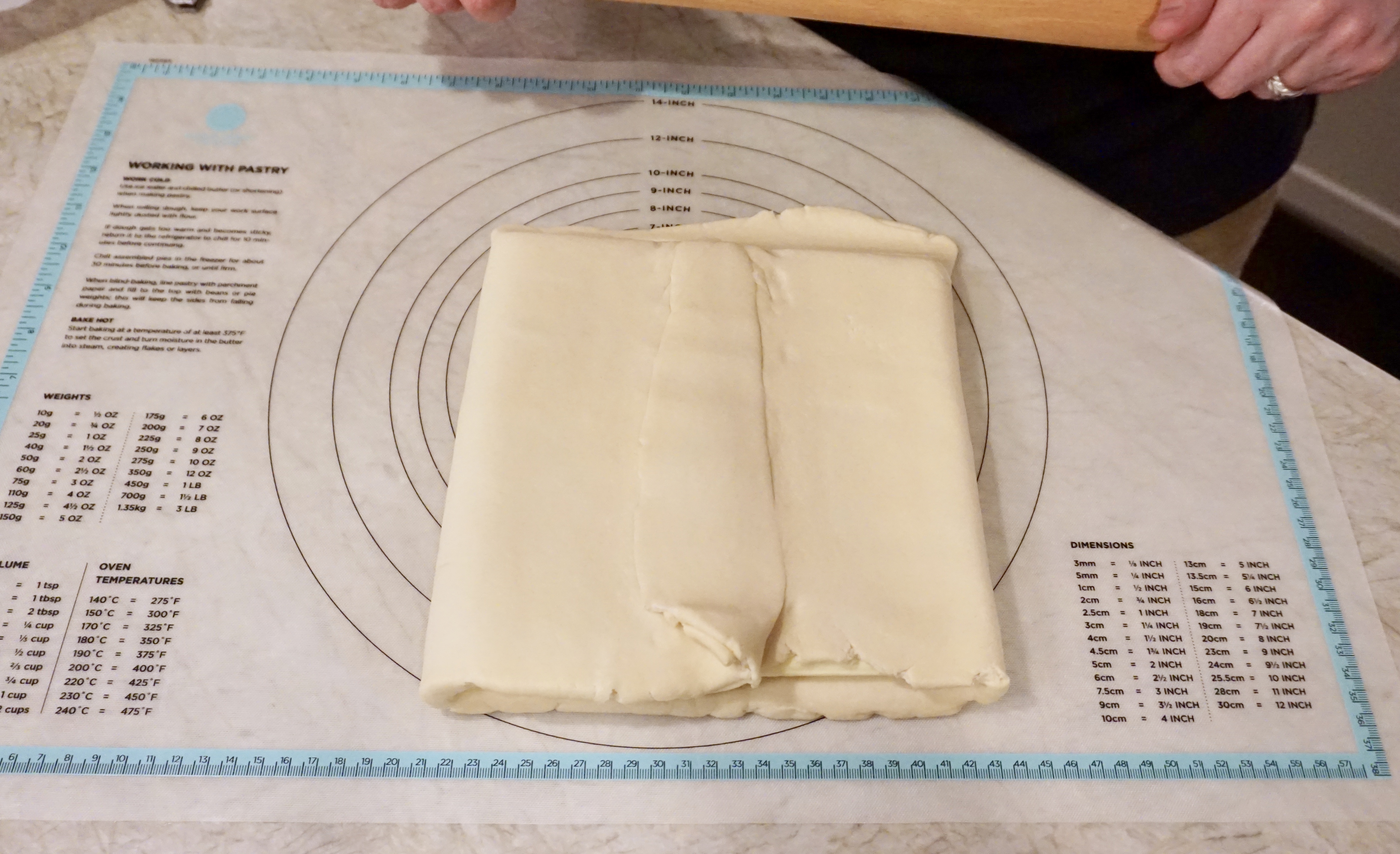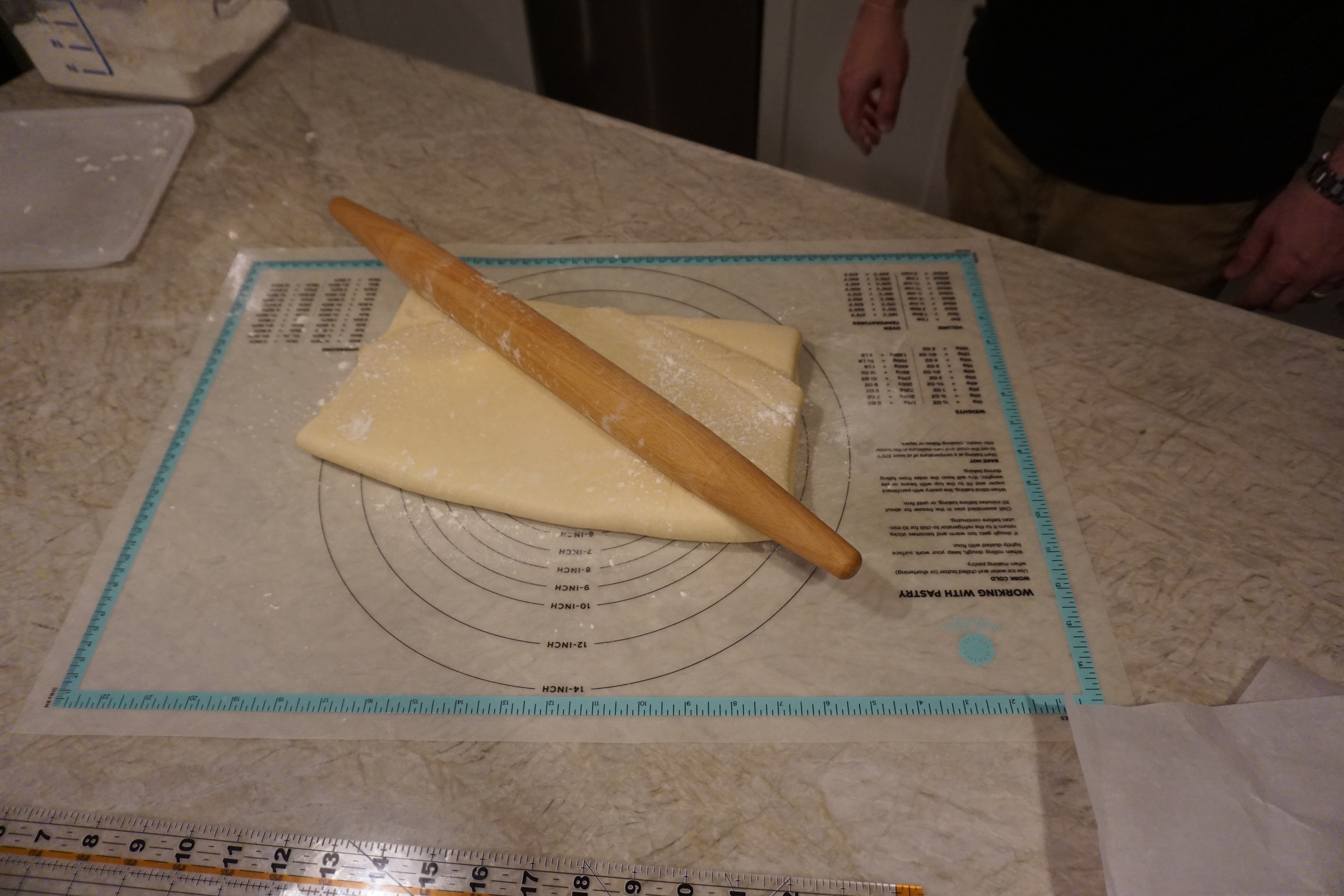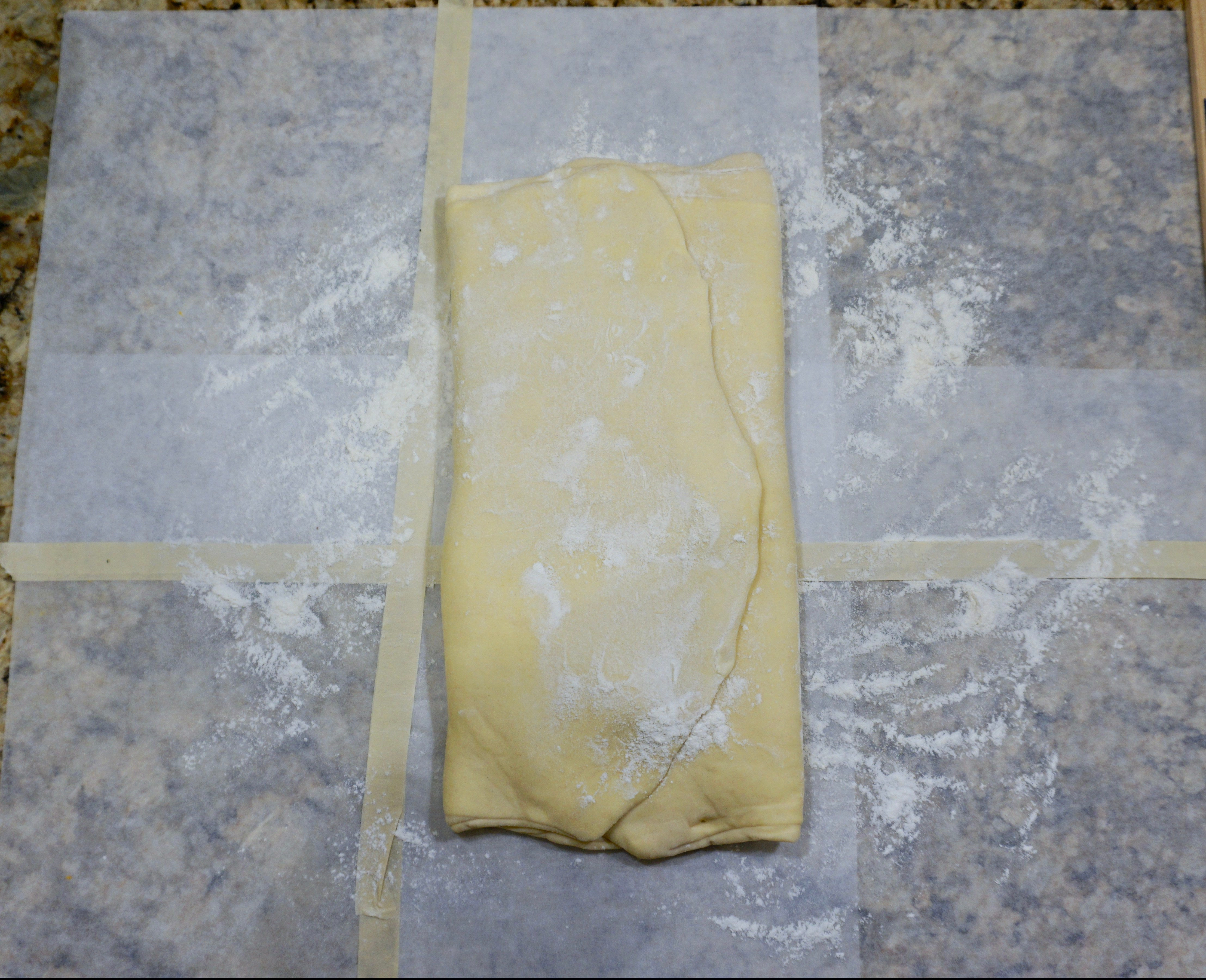After the 2 1/2 hours has passed, I pulled the dough out of the freezer and Kevin got in on the action by rolling the dough out to a 17-by-8-inch rectangle for me so that I could take pictures during the laminating steps. We have learned the hard way to make sure to gently dust your work surface and top of the dough with flour whenever you are rolling it out. Then, he unwrapped the butter block and placed it in the middle of the rectangle. He folded both sides up to the middle of the butter block and pinched them together. Next, he used the rolling pin to press together the dough at the top and bottom of the butter block. The idea is that the butter is completely surrounded by dough and unable to escape when rolled out. After it is completely sealed, he rolled the dough out to a 24-by-8-inch rectangle. Then fold the dough into thirds like you were folding a piece of paper to put into an envelope. Make sure to dust off any extra flour that may be stuck to your dough while folding it.