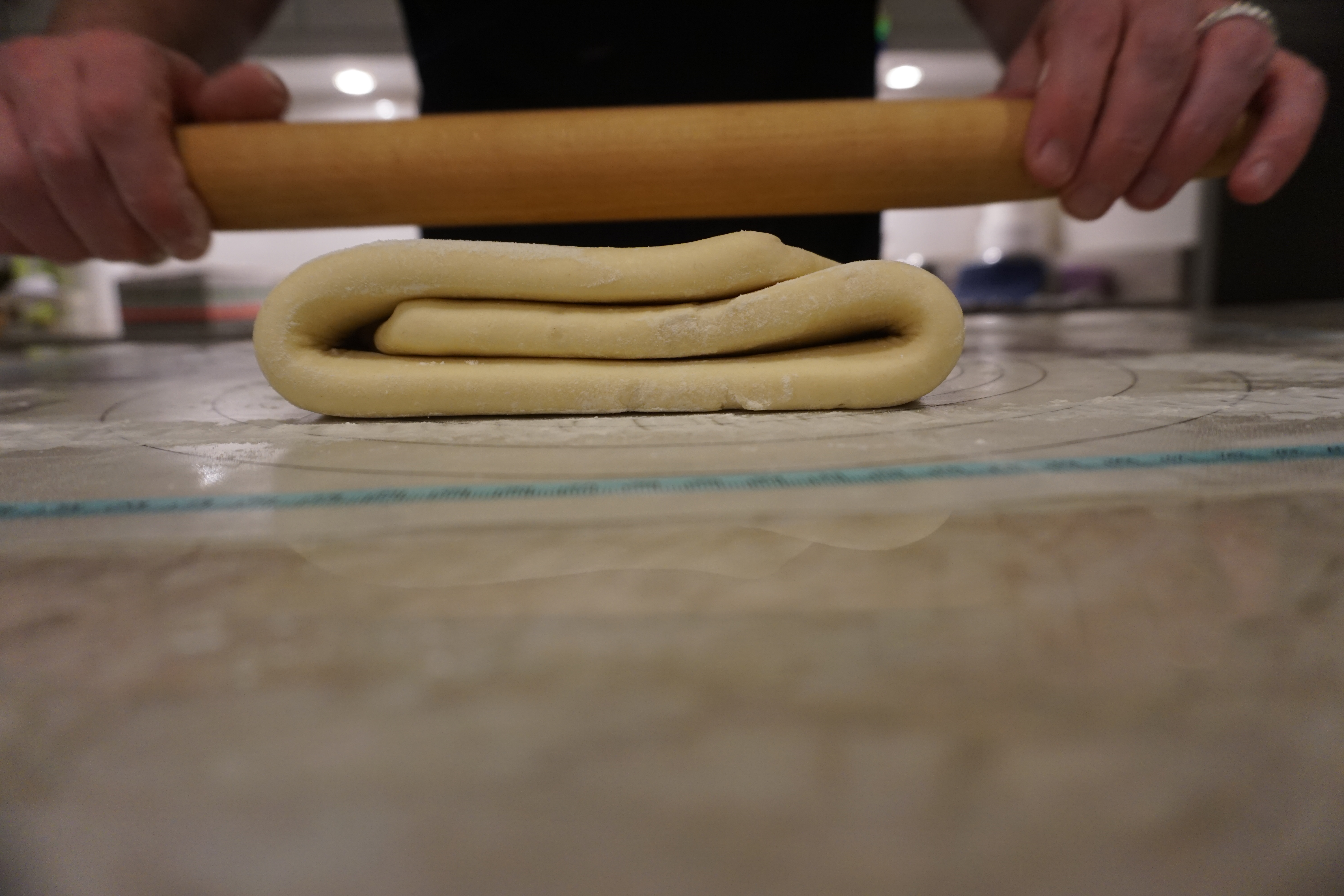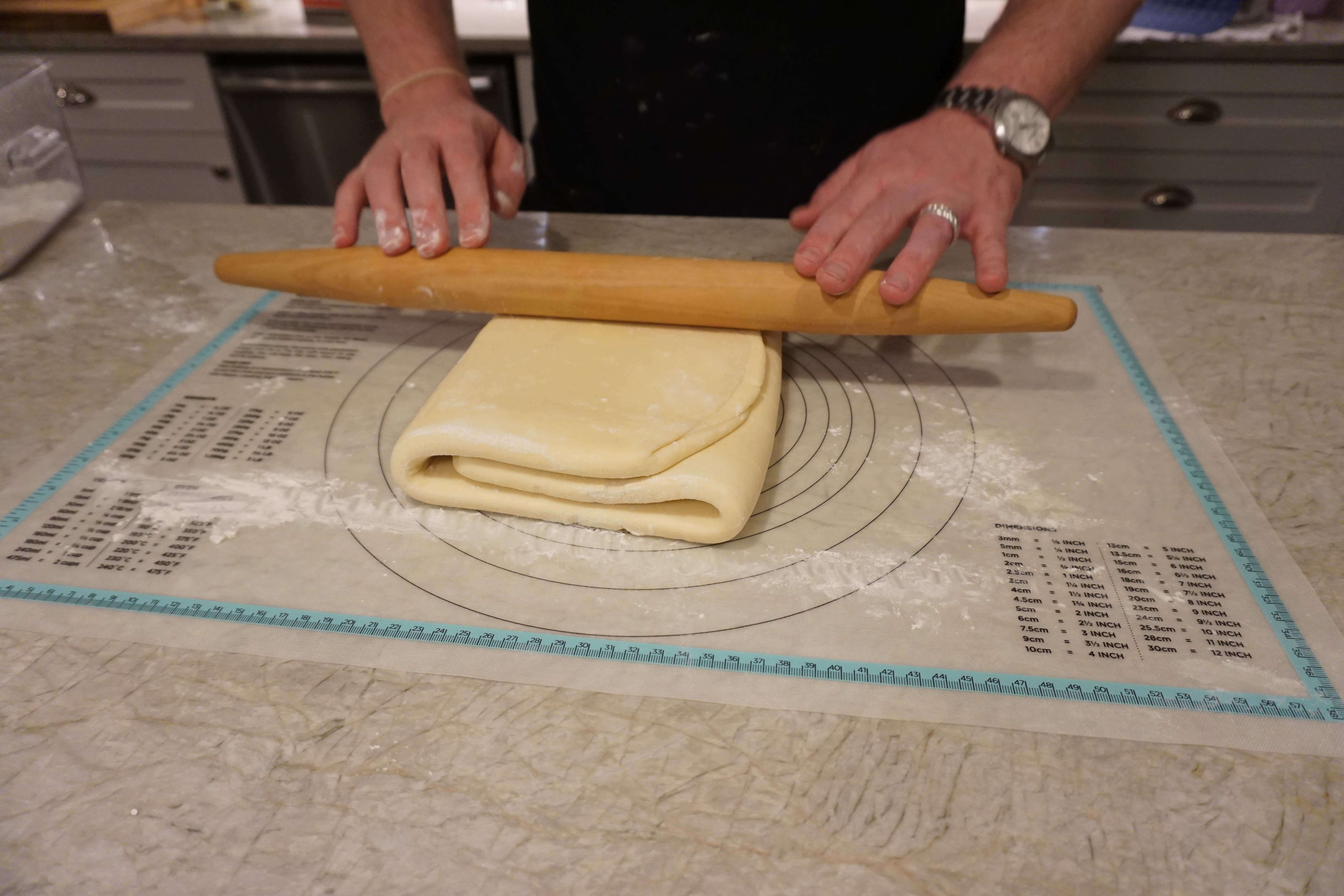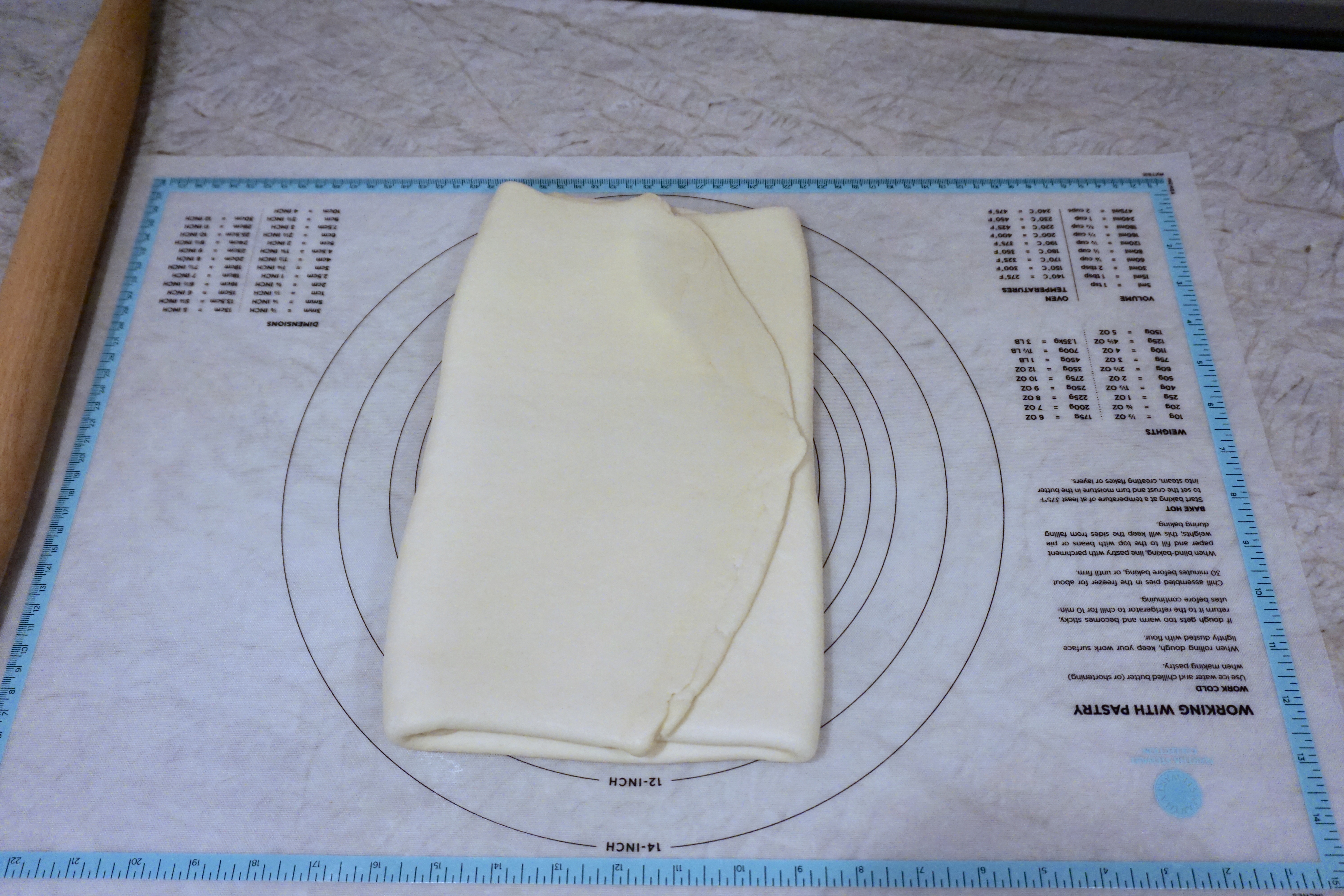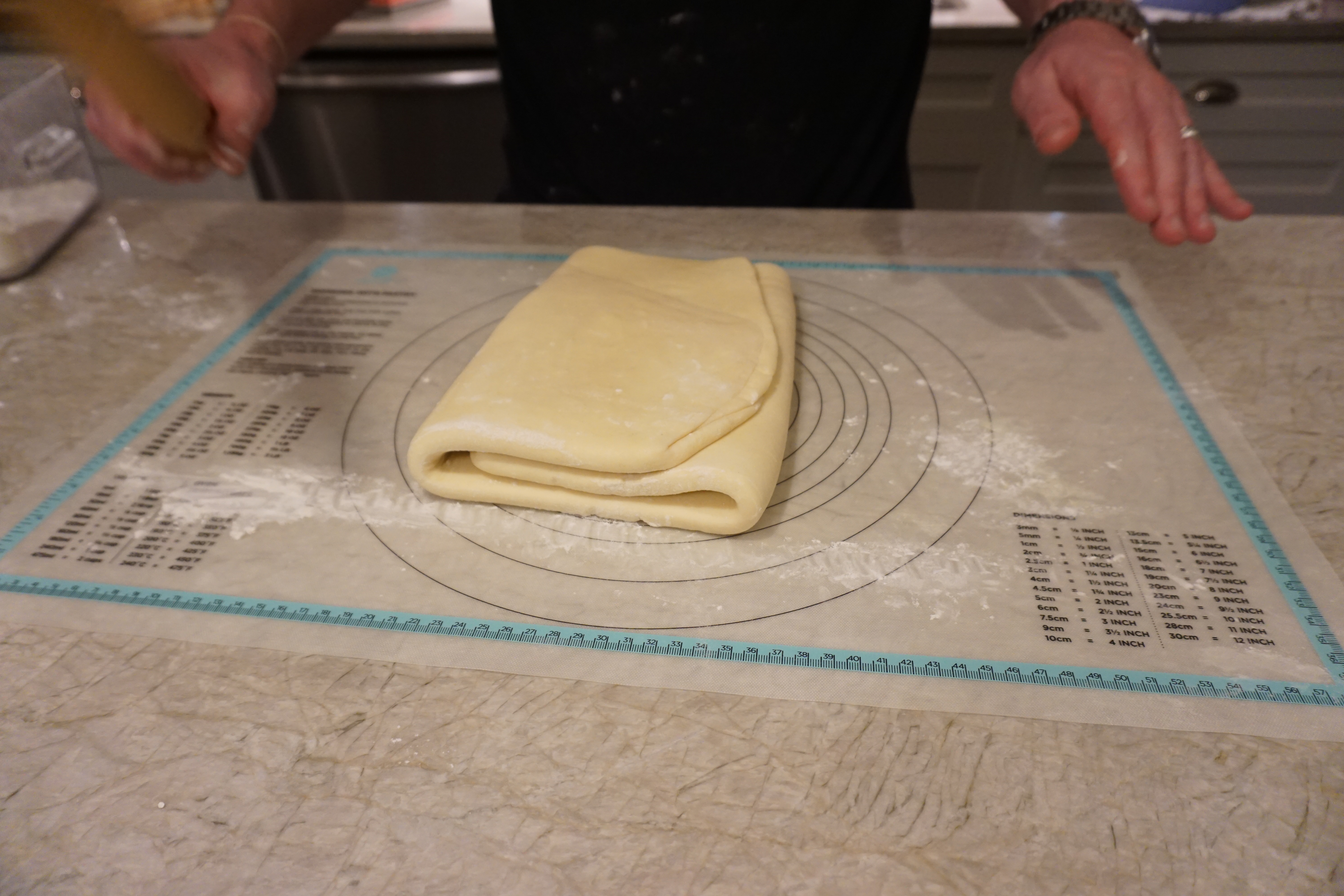 Next, we turned our dough 90 degrees and rolled it out again into a 24-by-8-inch rectangle. Then we folded it again into thirds, letter style, wrapped it up and put it back in the freezer for 30 minutes.