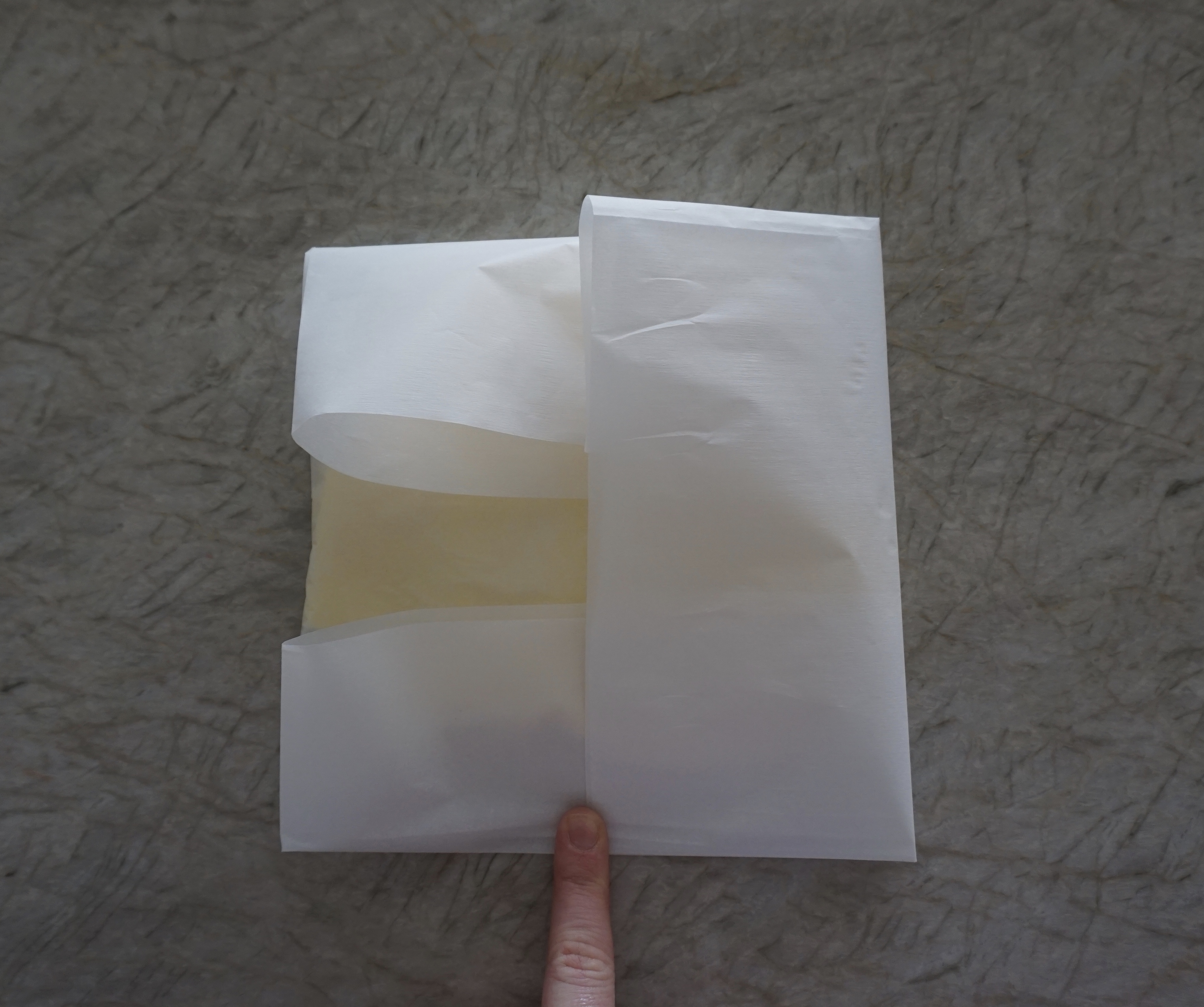 - Shape into a rough 6-inch square and transfer the butter into the center of one of the squares. Fold the paper around the butter and turn it over.