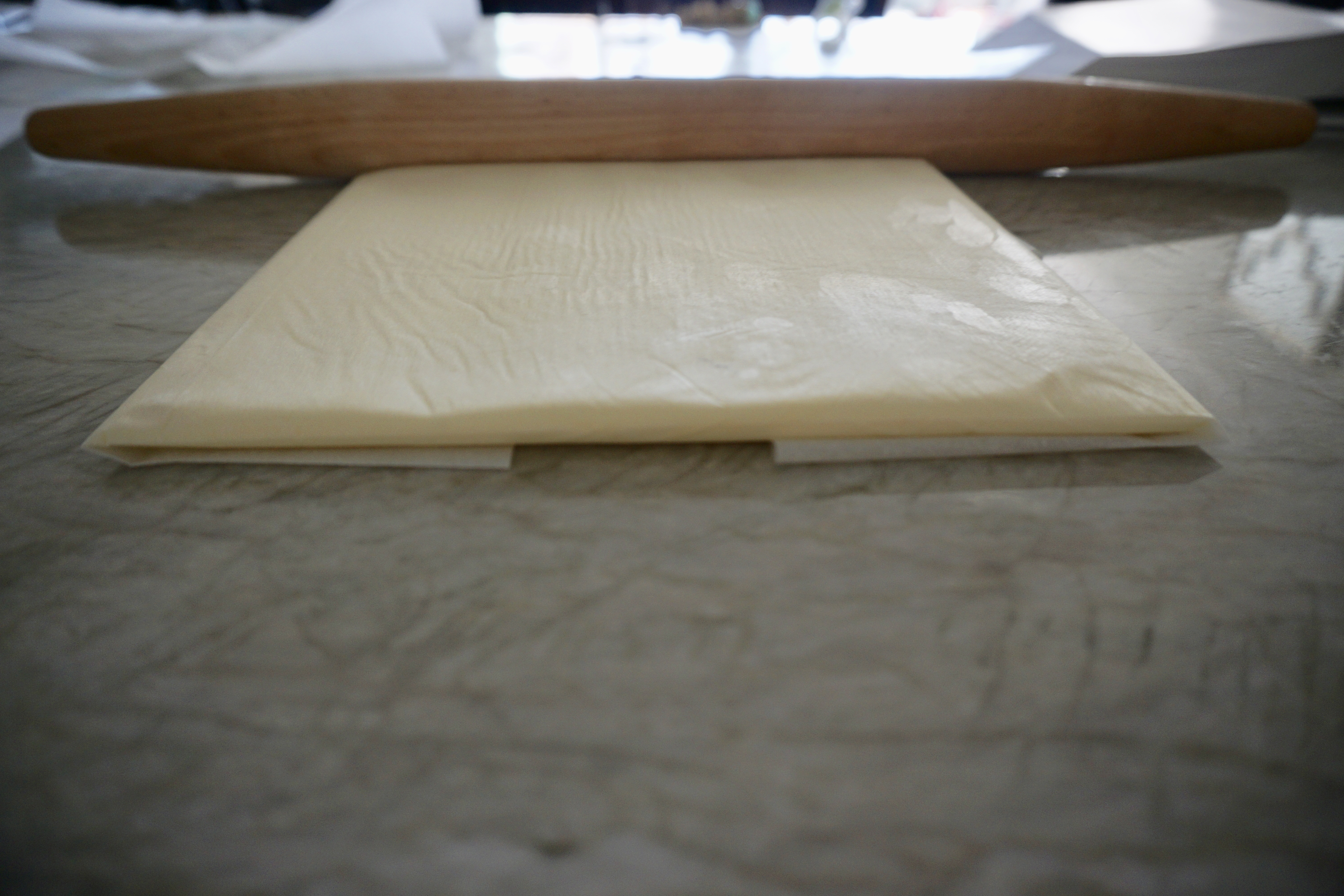 Guess what! After it rests for 30 minutes- you get to roll it out 1 more time! Pull it out of the freezer and rotate it 90 degrees again and roll it out to 24-by-8ish-inches long. Fold it into thirds like a letter, wrap it tightly in plastic wrap and place it on the fridge for 2 hours and then transfer it to the freezer for 30 minutes.