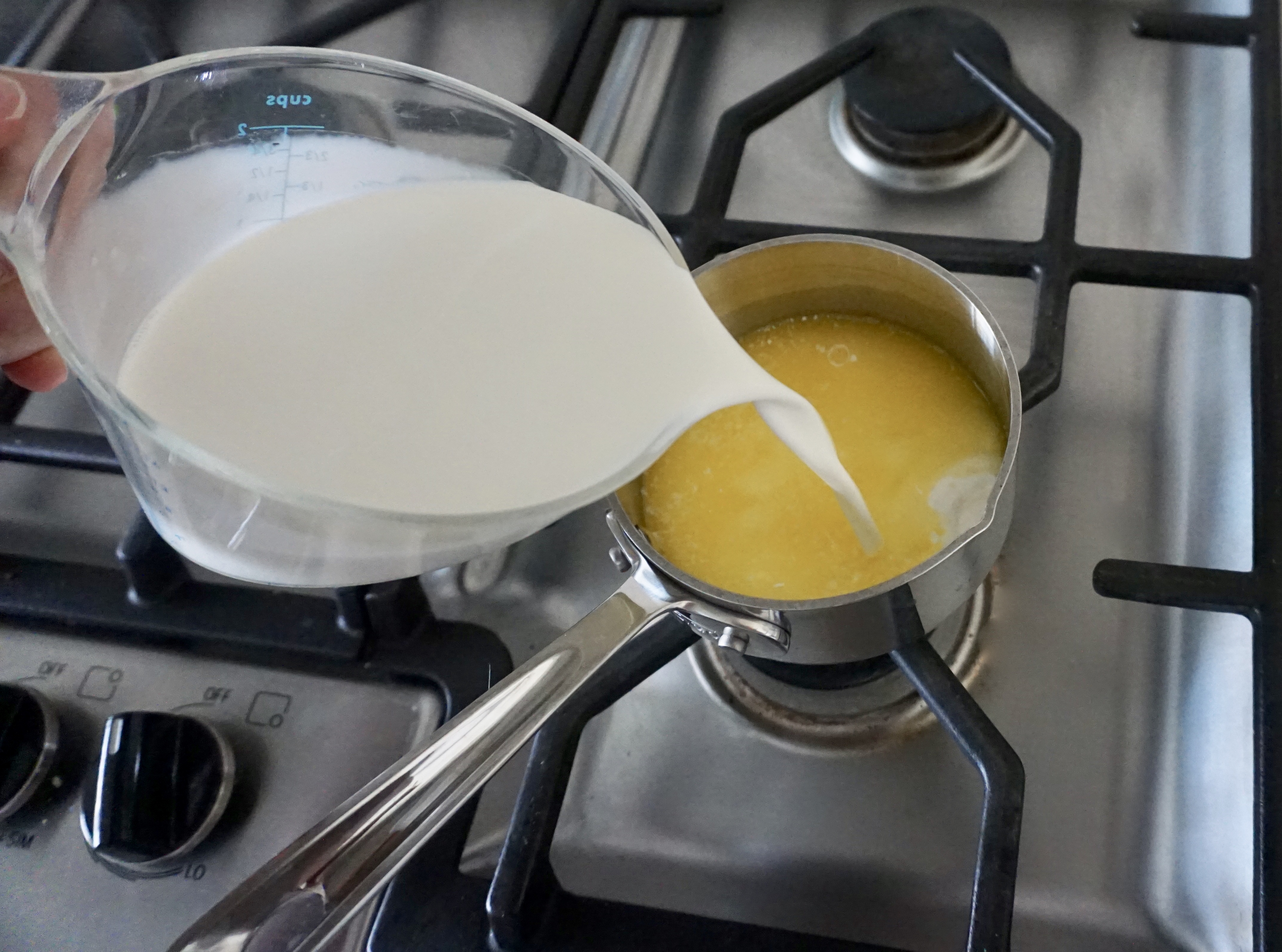 - Melt 3 tablespoons butter in a saucepan over low heat. Remove from heat and immediately stir in the milk (check that the temp is below 90 F degrees). Whisk in the yeast.