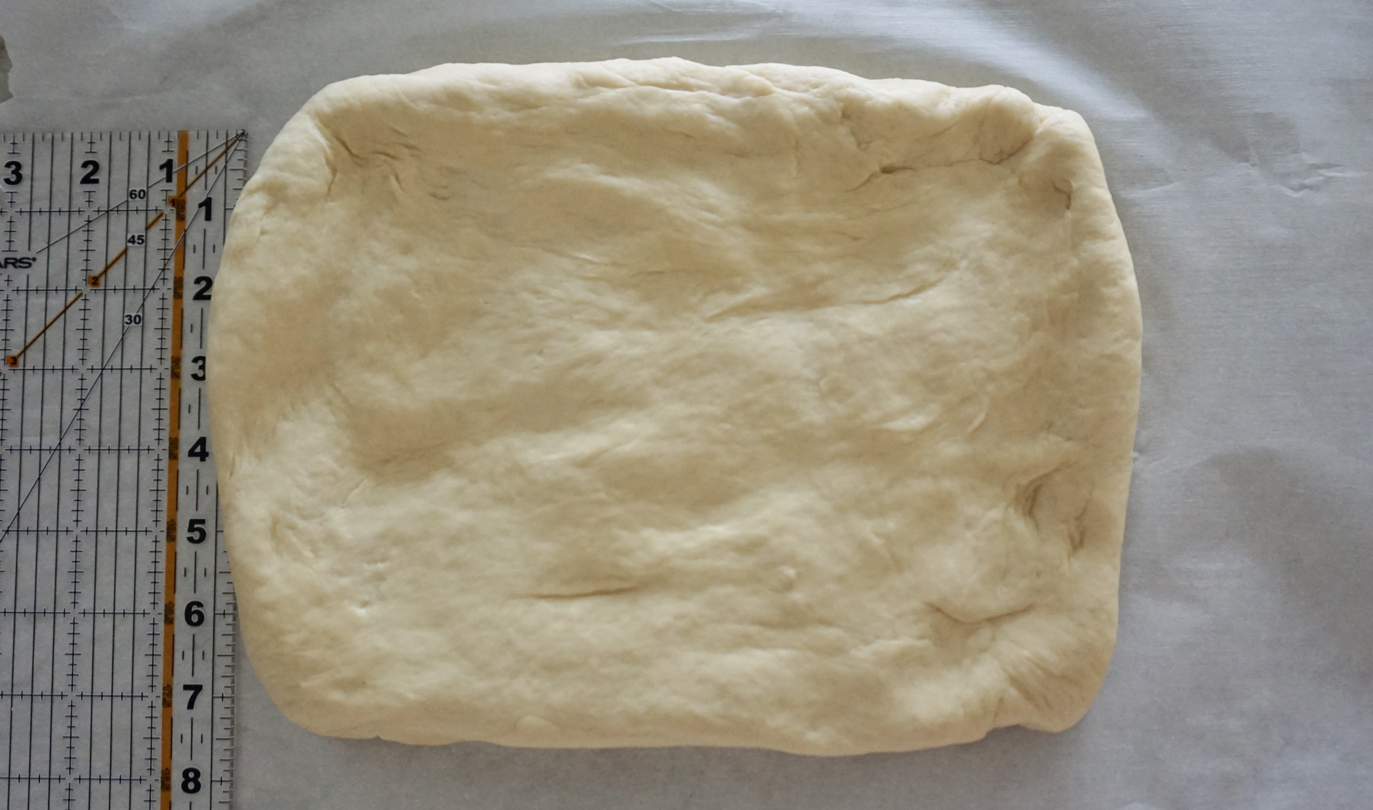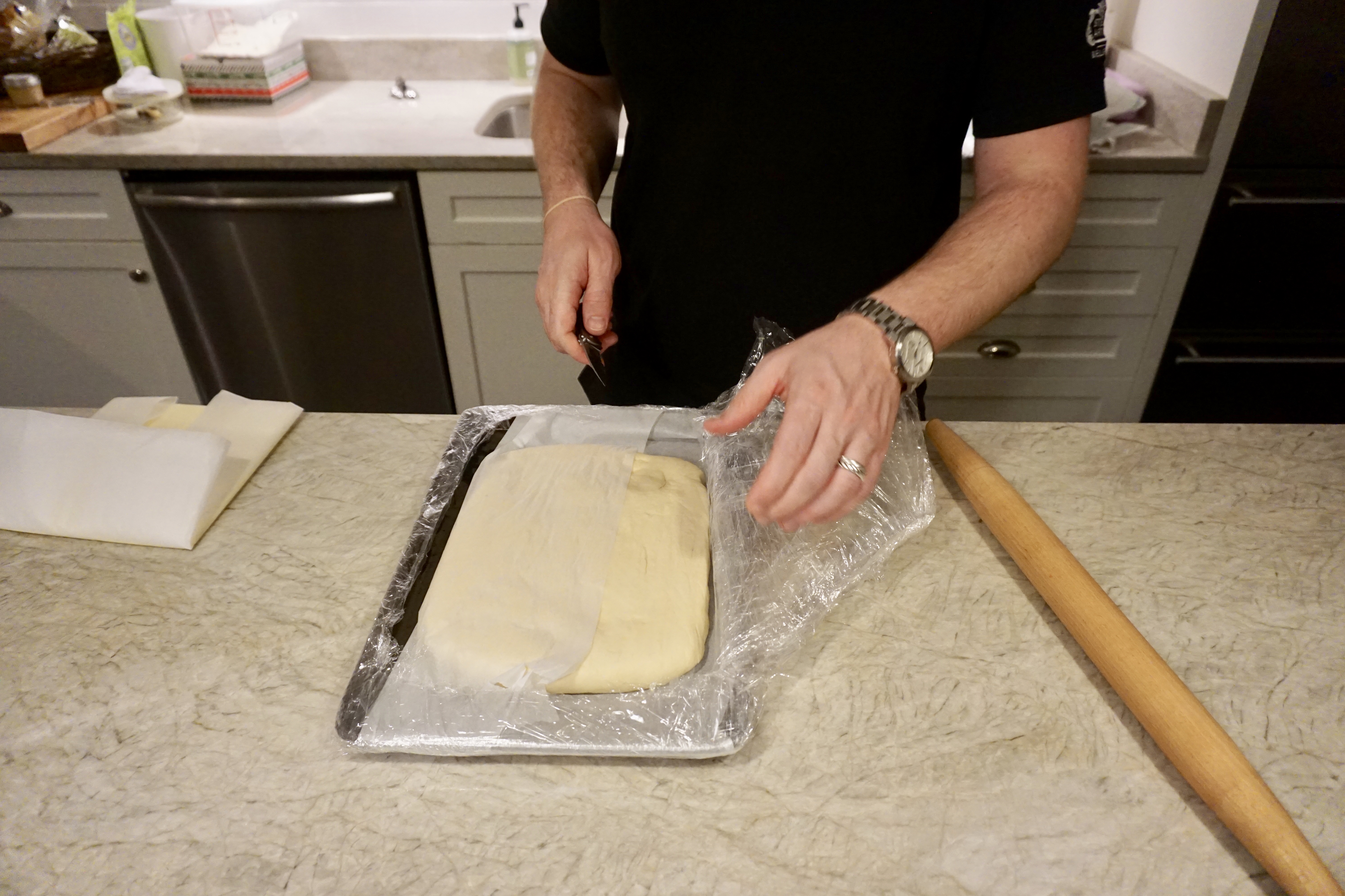 After 30 minutes of rise and rest time, I took the dough out of the mixing bowl and used my hands to gently shape it into a 10-by-7-inch rectangle. Then I moved the parchment paper to a sheet pan that I knew would fit in BOTH my fridge and freezer and wrapped the dough tightly in plastic wrap and put it in the fridge for 2 hours. After 2 hours, I moved it to the freezer for 30 minutes to really firm up.
