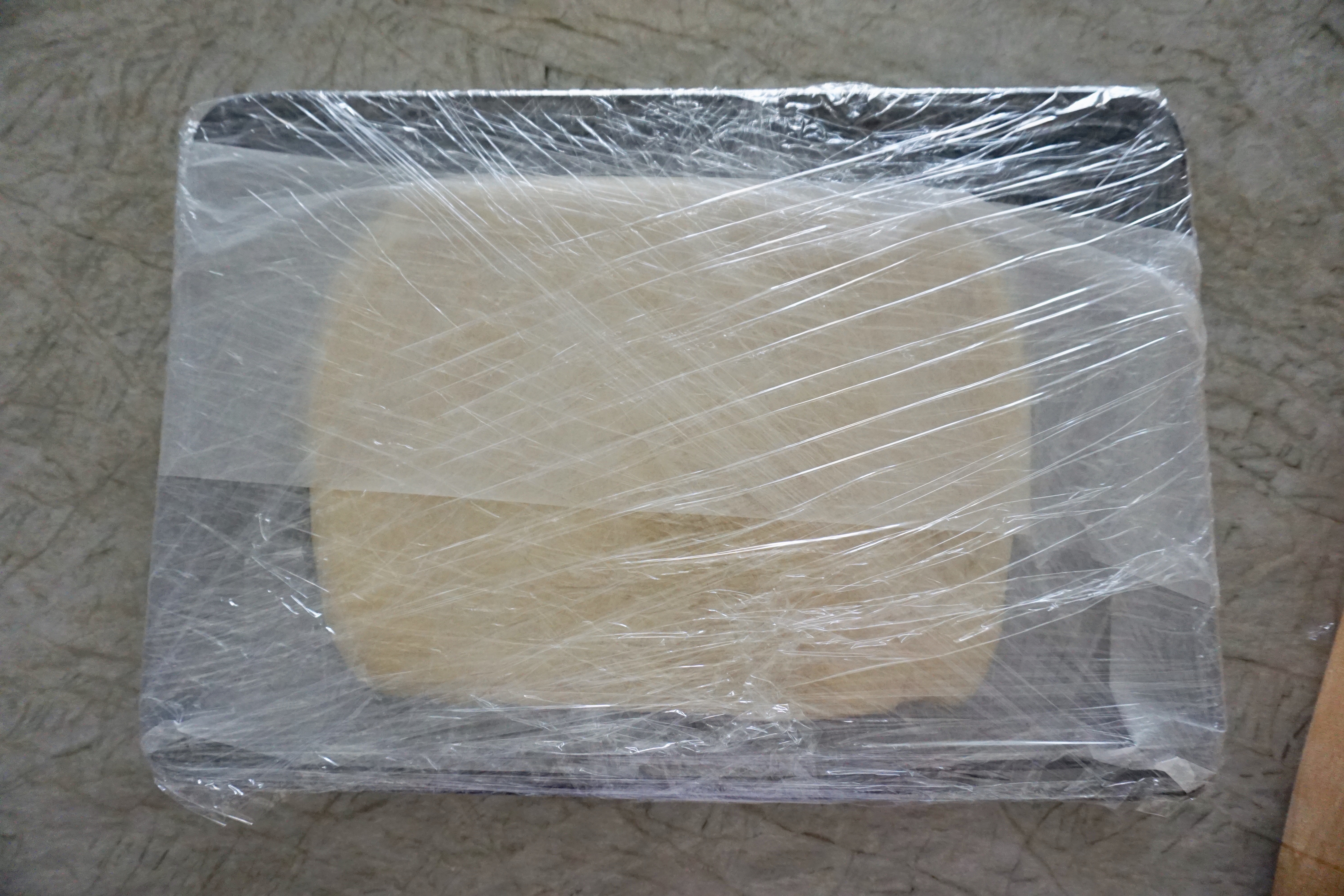 - Fold the dough in thirds and wrap it tightly in plastic wrap and place it on a baking pan and in the fridge for 2 hours. Then put it in the freezer for 30 minutes.
