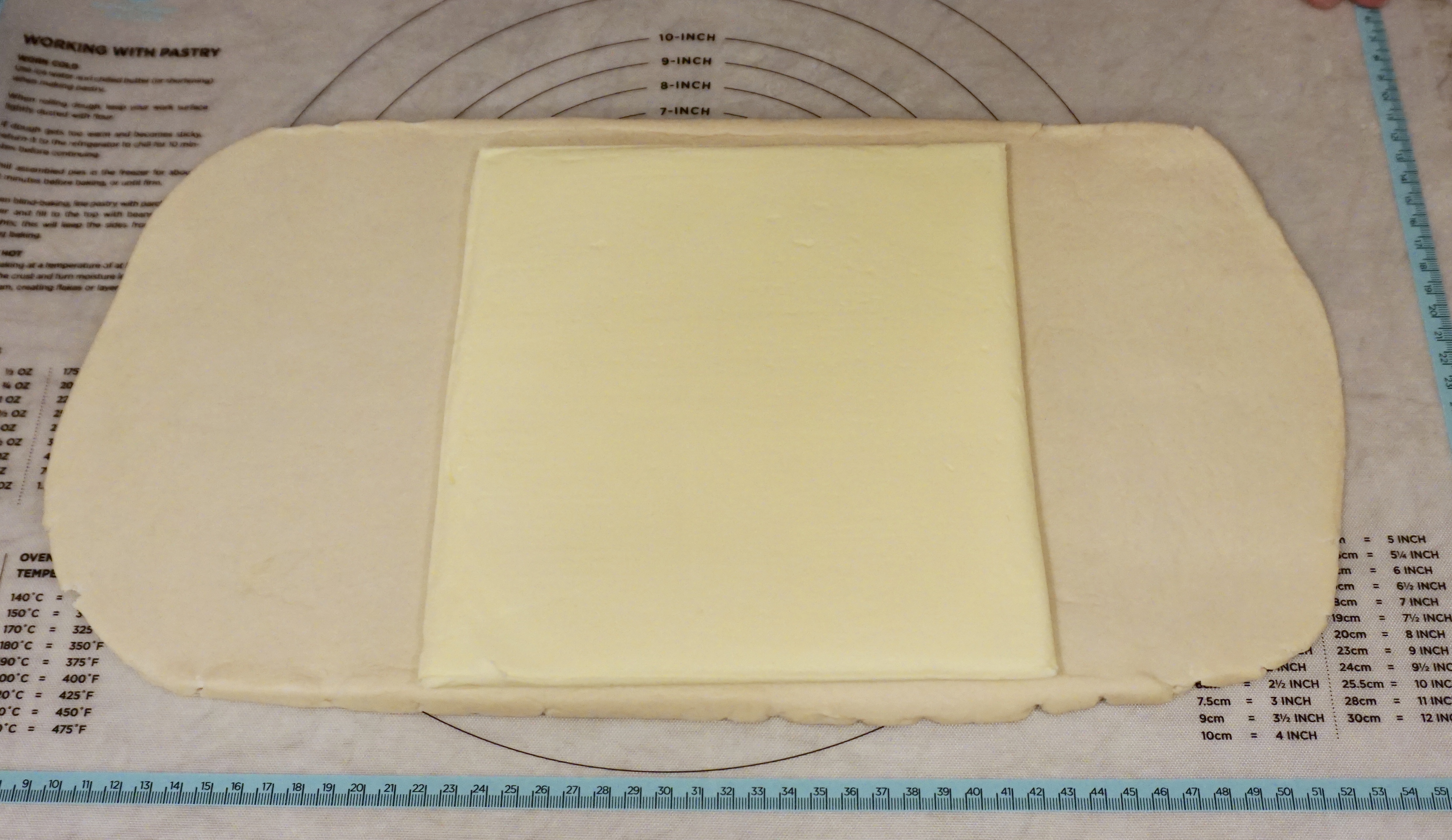 - Unwrap the cold butter and place it in the middle of the dough. Fold the long sides of the dough into the middle and pinch it shut.