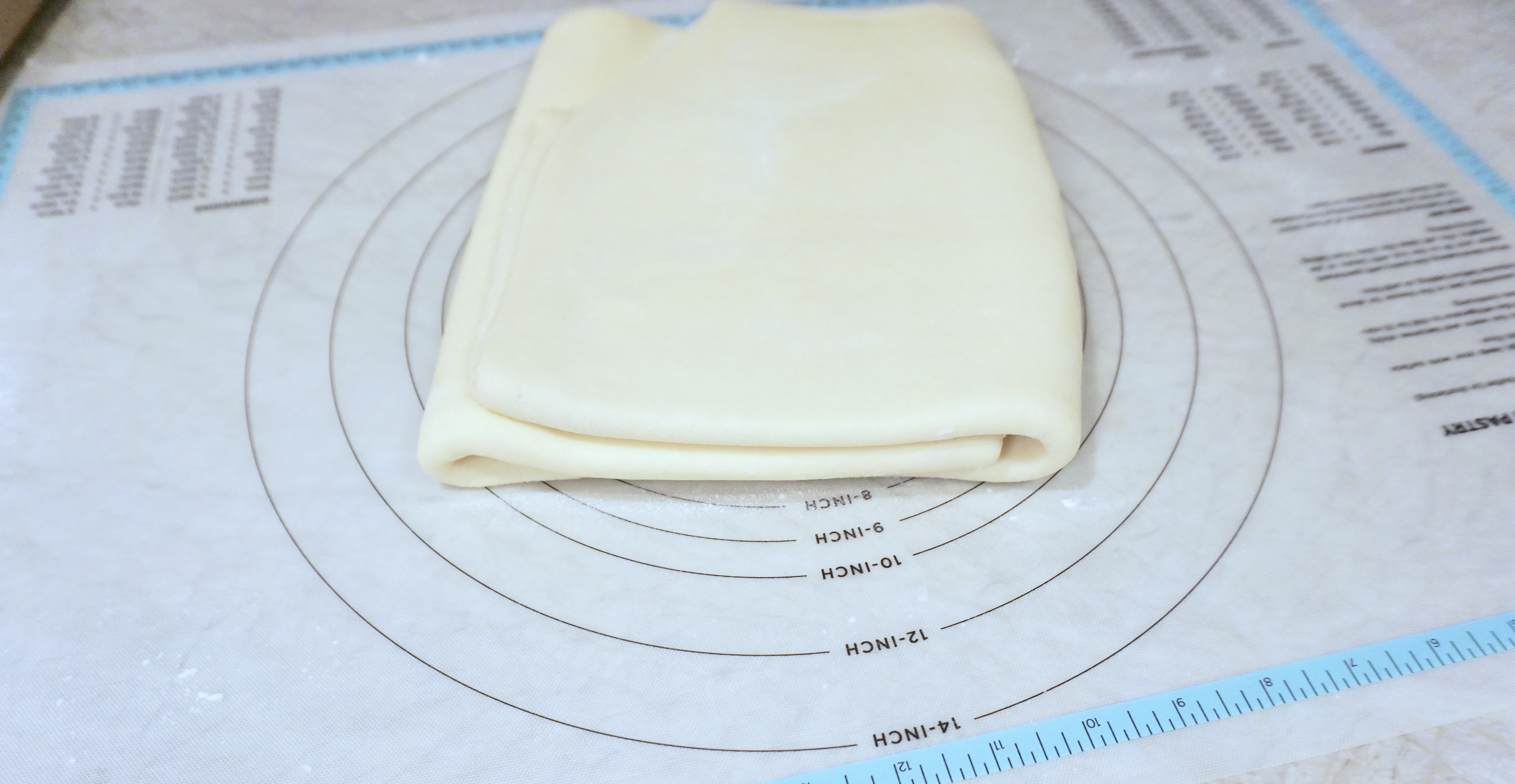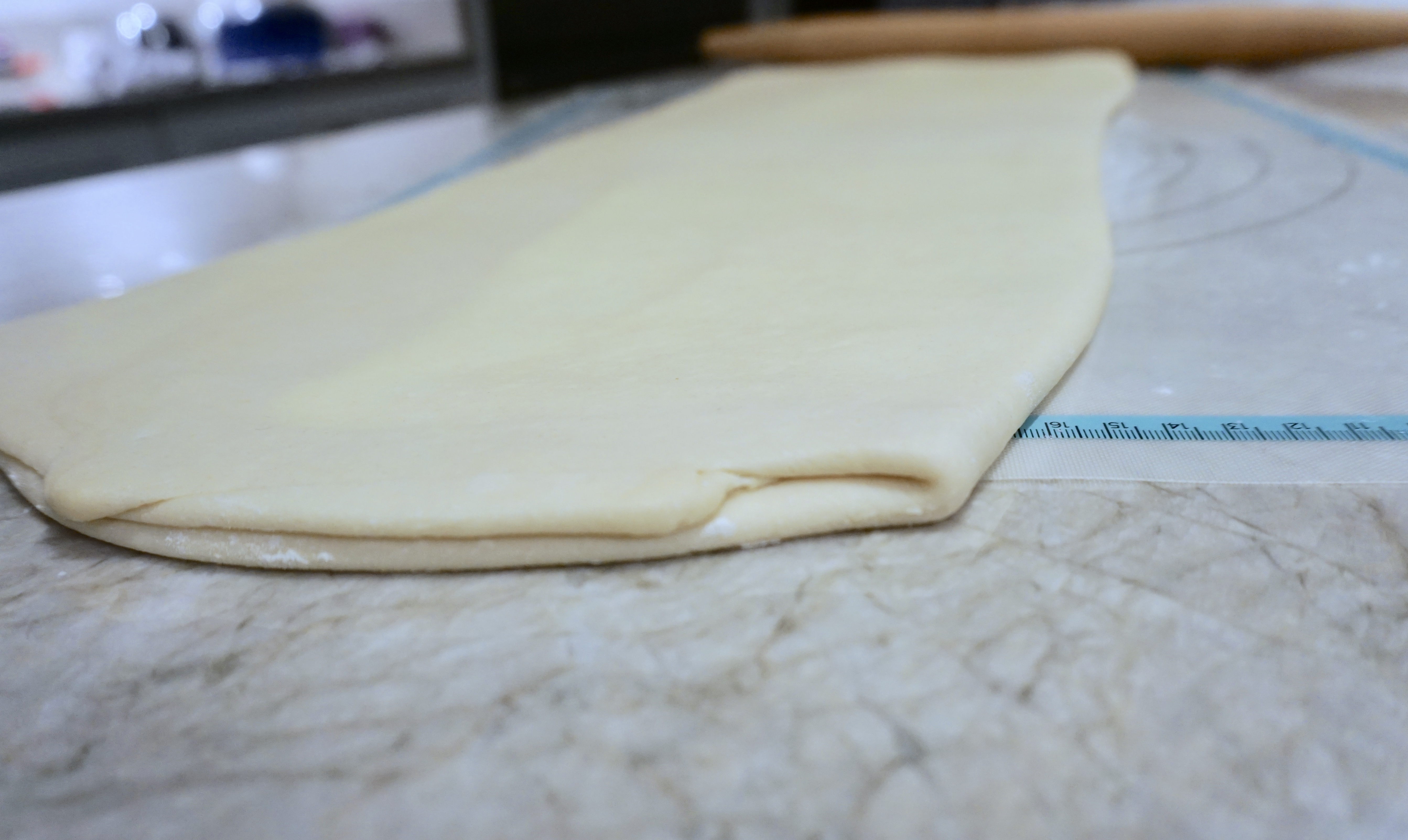 - After chilling, rotate the dough 90 degrees and roll it out for a third and final time to a 24-by-8-inch rectangle.
