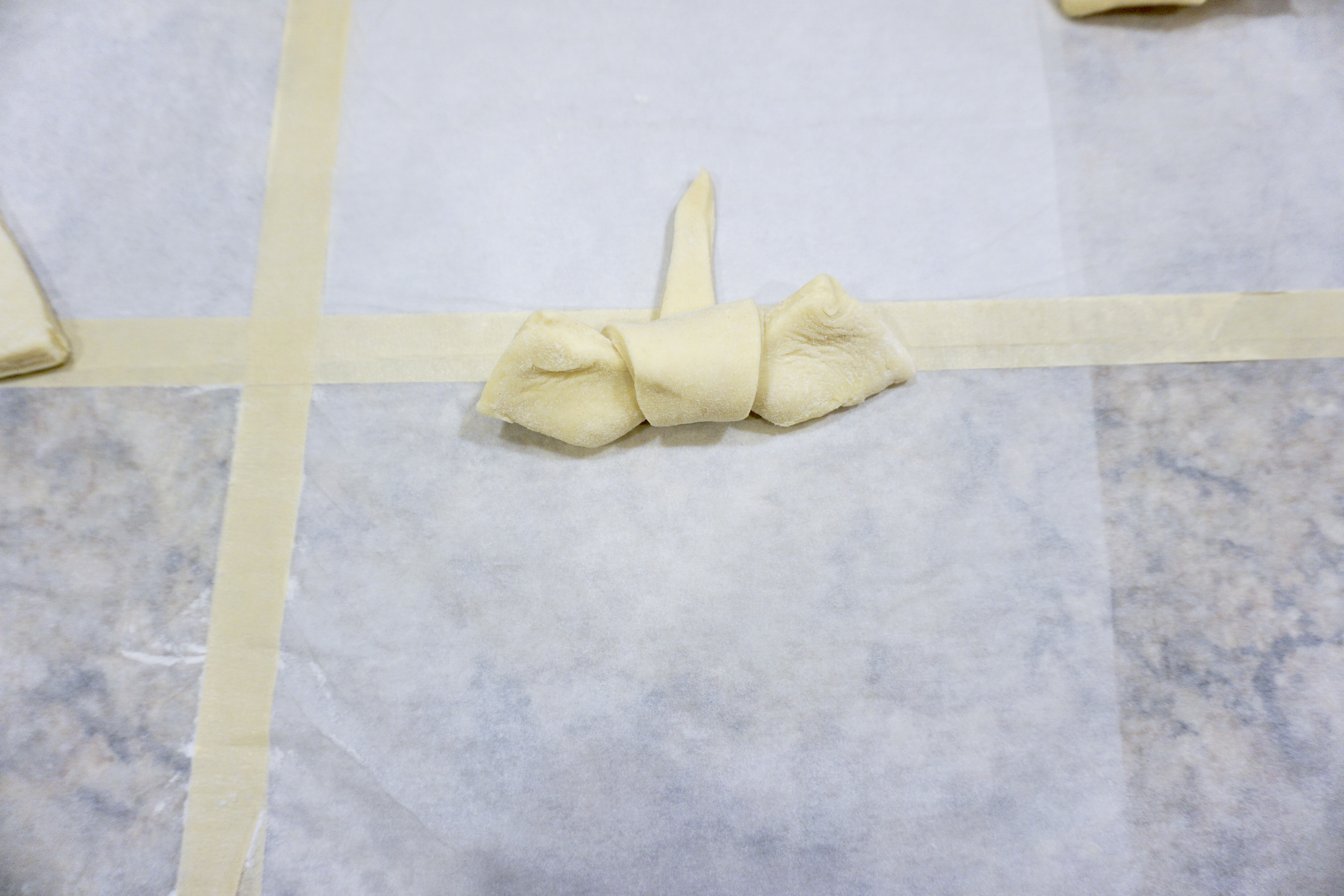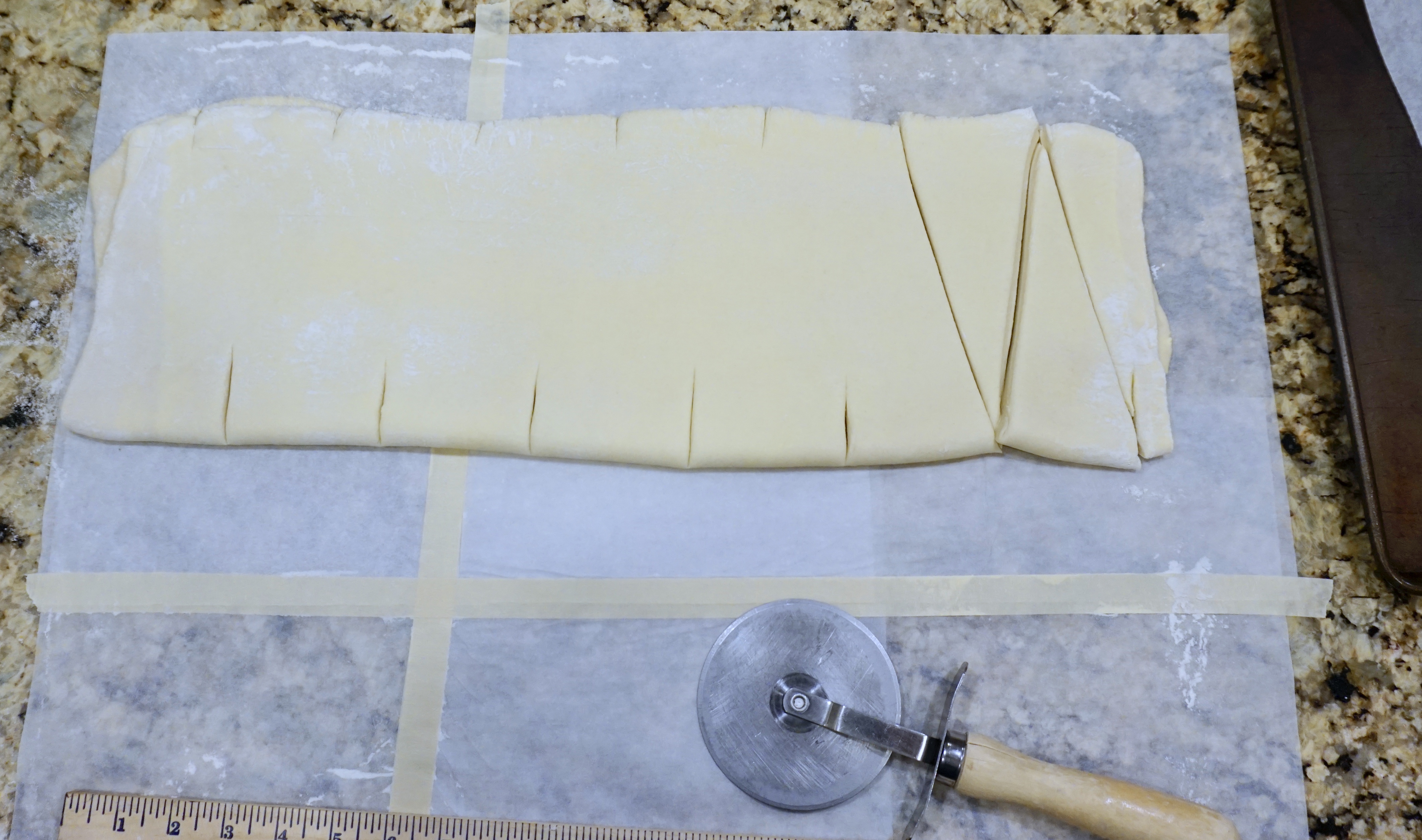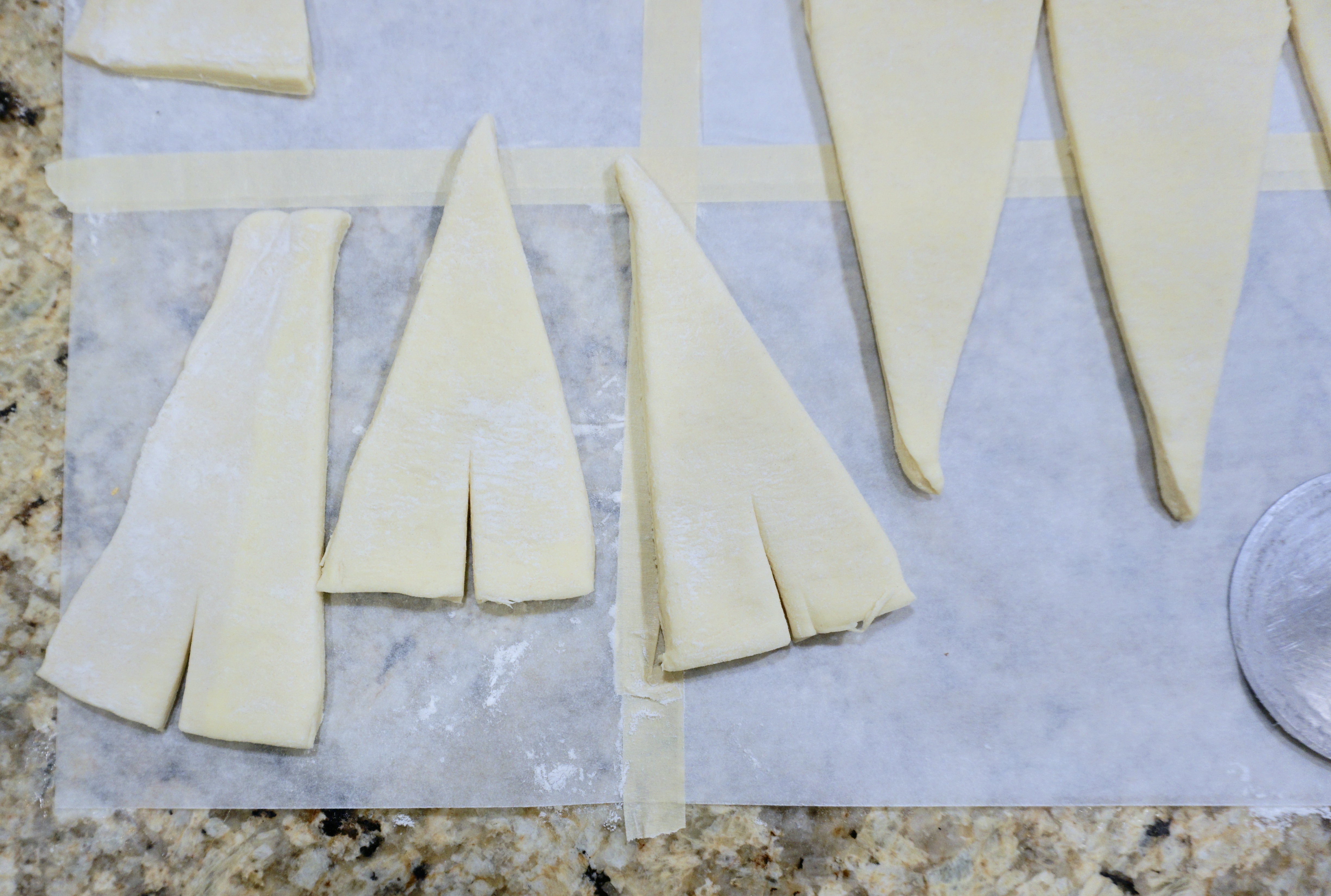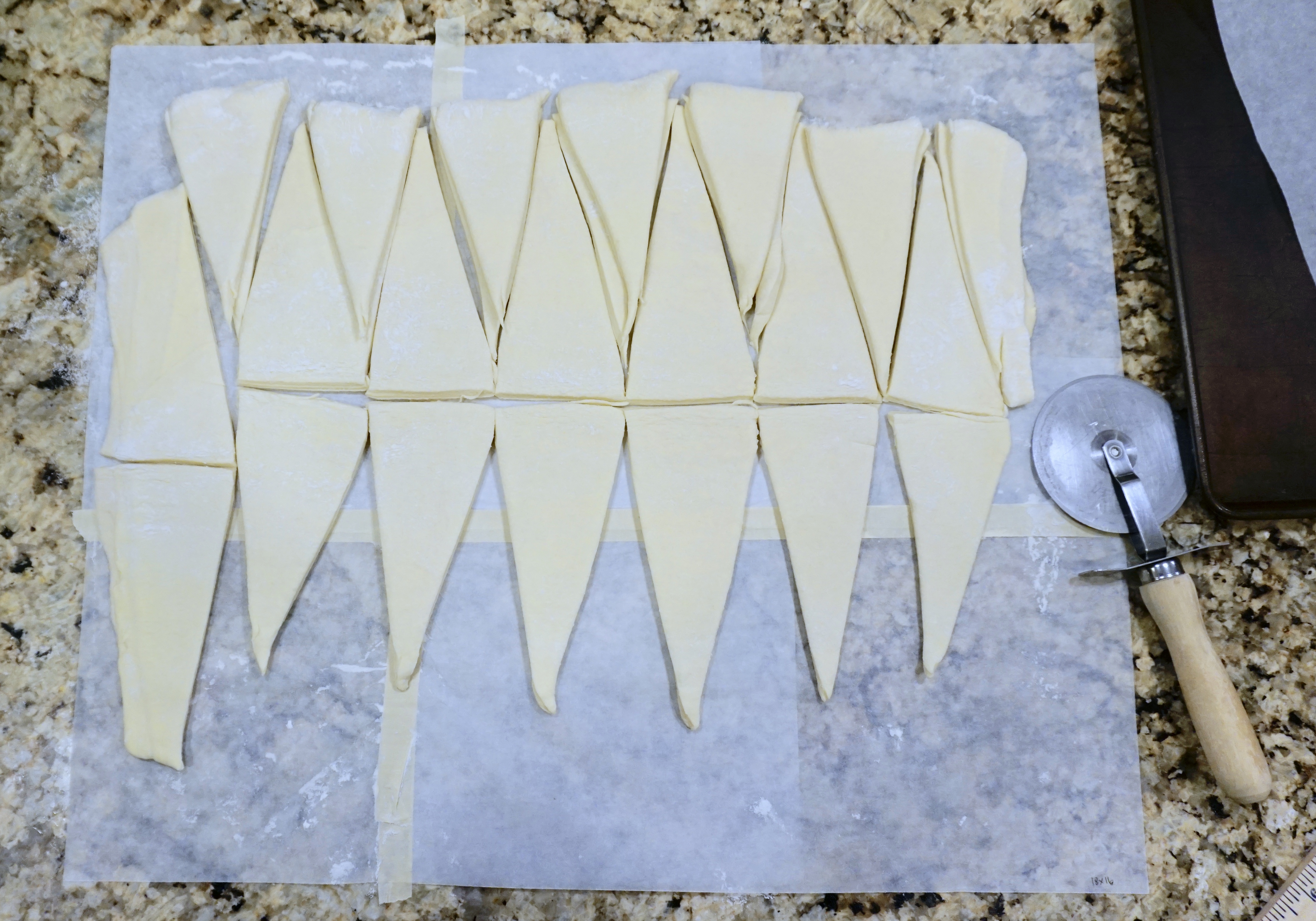 To begin the process, I pulled the dough out of the freezer and dusted it and the counter with flour. Then I rolled it out to an 18-by-16-inch rectangle. Next, I folded it so that the 18-inch sides of the rectangle met up at the top of my work surface. Using a ruler I used a pizza cutter to mark off 3 inch increments in the bottom of my dough. Then I moved my ruler to the top of the dough and marked off 1 1/2-inches from the top left side of the dough. I placed the end of my ruler at the mark and then marked off 3-inch increments from there to the end of the dough. Using the pizza cutter I connected the cuts from top to bottom making triangles. Some of the triangles were still connected at the bottom, so I unfolded those pieces and cut through the middle making them into triangles. Again if your dough gets soft, you can place it back in the freezer for a few minutes to firm up.