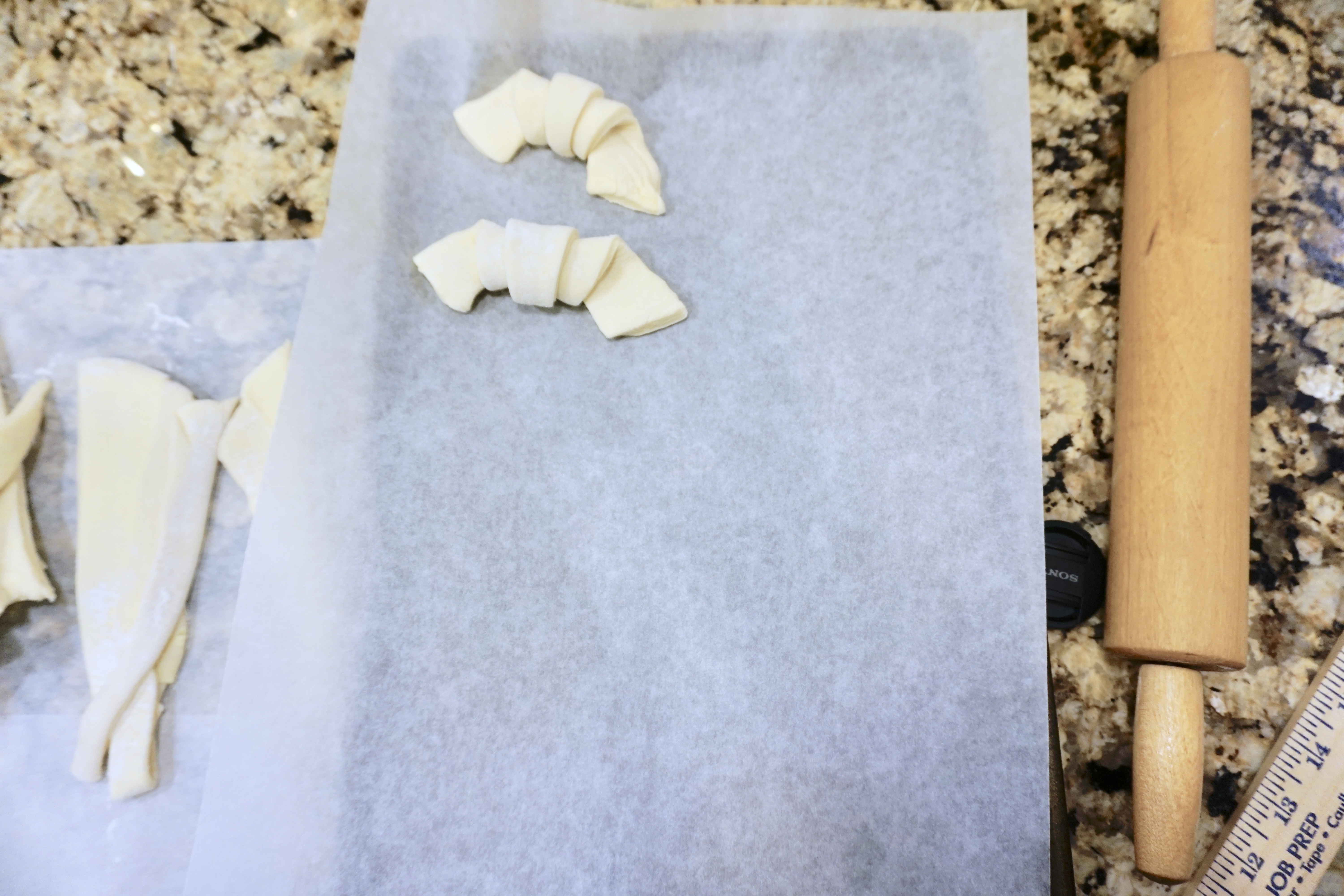 - Place each of the shaped croissants on a parchment lined baking tray.