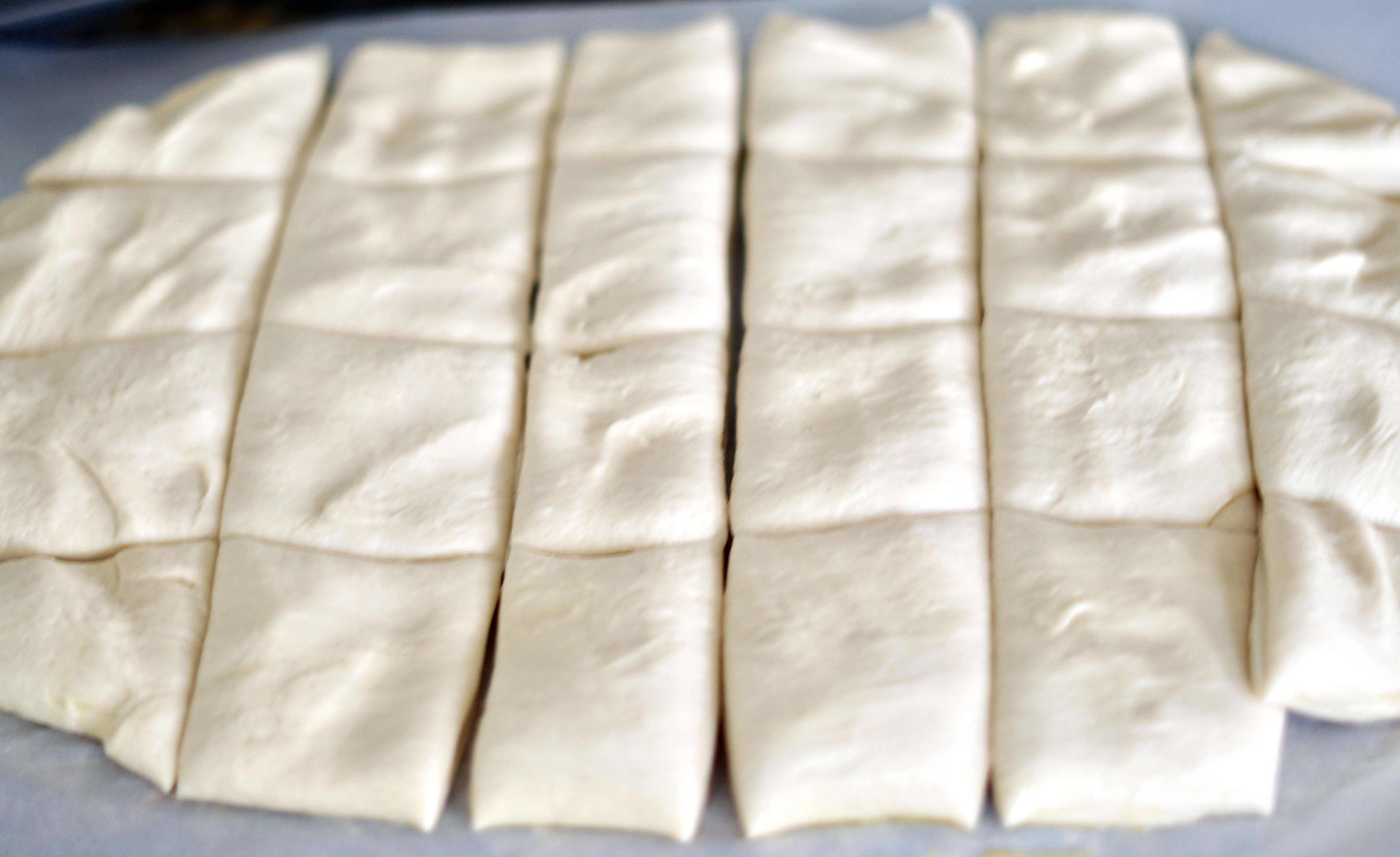 Dump the dough out onto a piece of parchment paper and use your hands to deflate the dough and shape it into a rectangle about 8-by-12-inches. Then use a pizza cutter or a sharp chefs knife to cut it into 4 long horizontal strips. Next, slice 6 vertical strips across the horizontal stripes creating 24 squares. If some look larger than others it is totally fine to pinch some dough off and add it to the small pieces. My corner pieces always end up smaller than the others.