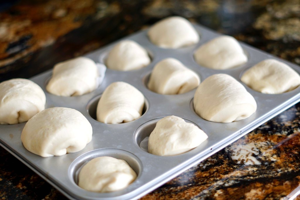 Next, fold the squares over and put them on top of the parchment circles in the muffin tins. You could also use your hands and shape the dough into spheres if you want. At this point, I cover both pans with plastic wrap and put one pan into the freezer and leave the other on the counter to rise for 20 minutes. While the dough is rising for the second time, I preheat the oven to 350 F degrees.