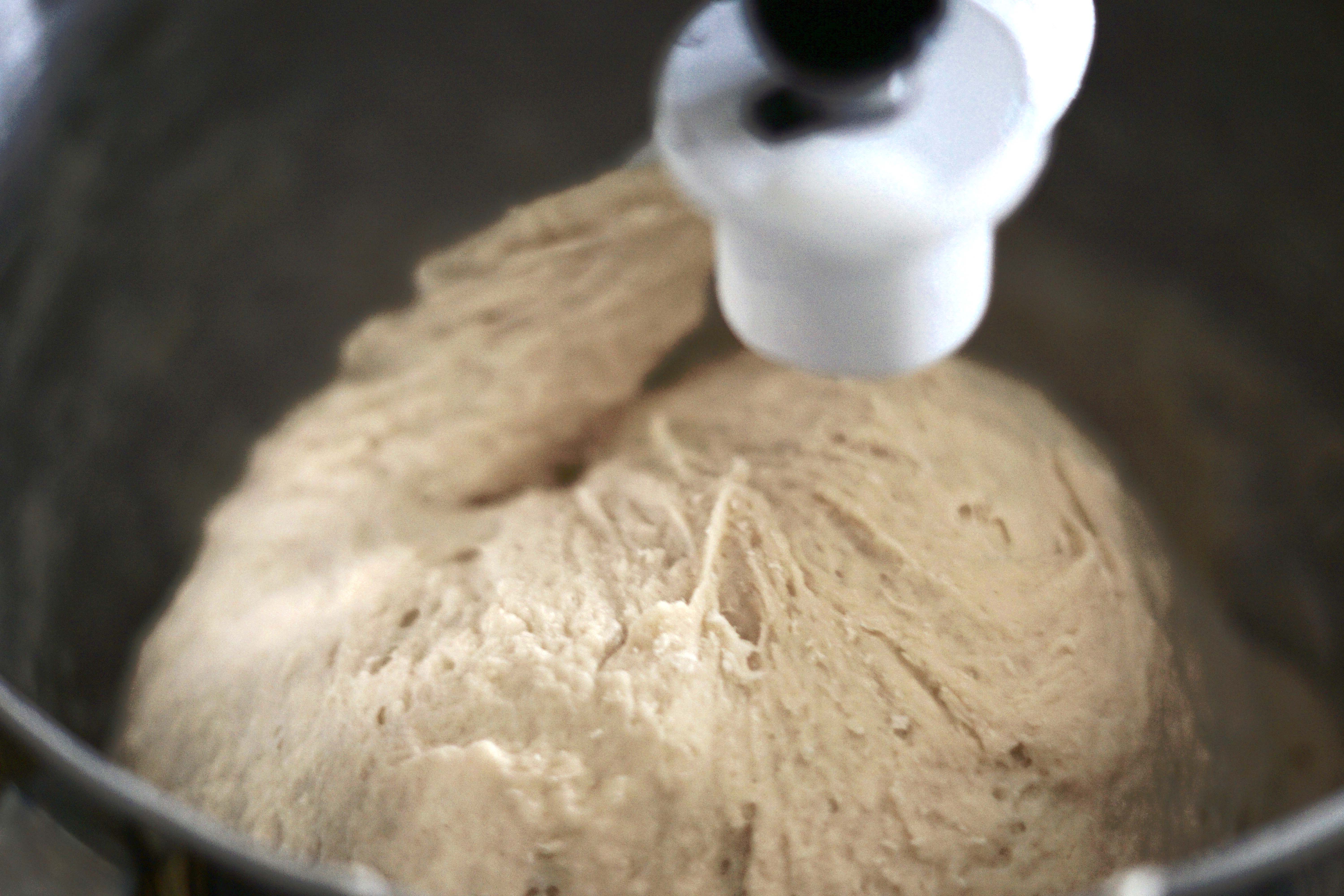 - Add 5 cups of flour and mix with the dough hook attachment until the dough forms a rough, shaggy mass. The dough will not form a ball at this point, but will be just shy of coming together.