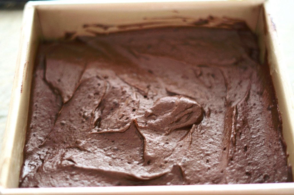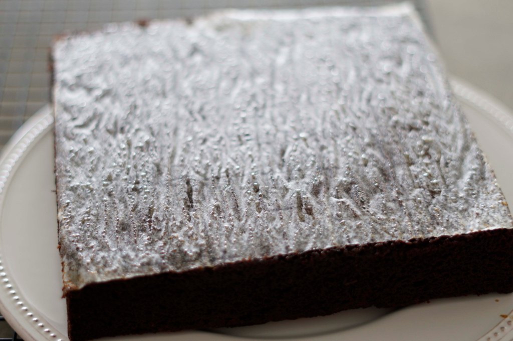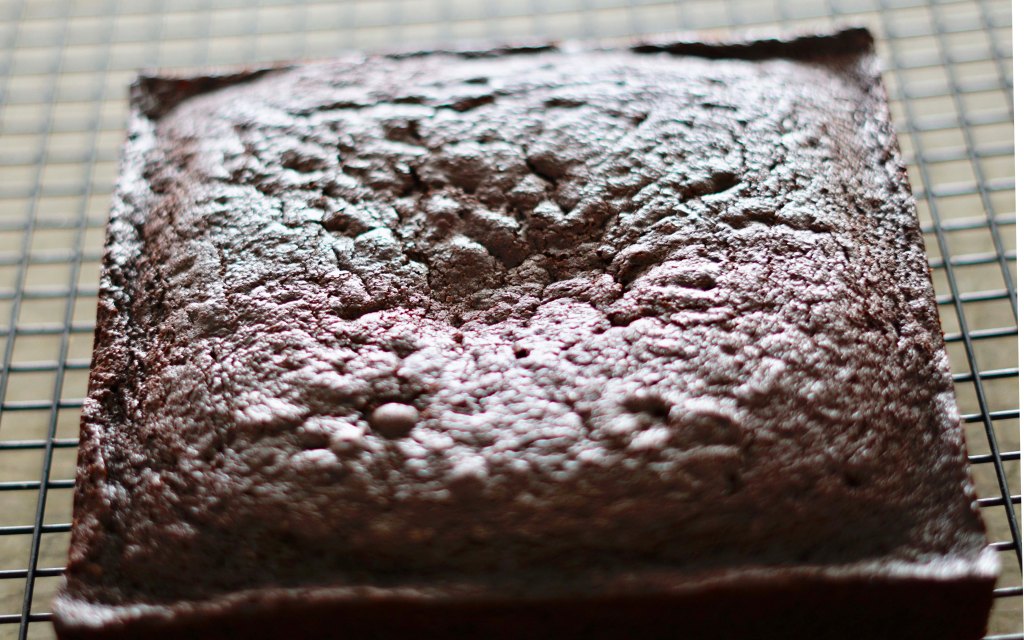 Finally, I mixed in 1/2 cup dutch-process cocoa powder and 1 cup of all purpose flour until it was all incorporated and then carefully stopped so that I didn’t over mix it. This saved the batter and turned it into a beautiful thick chocolate mixture. I poured this into the prepared baking pan and smoothed the top. I baked the cake for 25 minutes, until a toothpick came out clean after being tested in the middle of the cake.