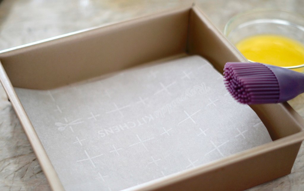 - For the cake- Preheat the oven to 350 F degrees. Coat an 8-inch-square baking pan with butter and cut a square of parchment paper and put in the bottom of the pan.