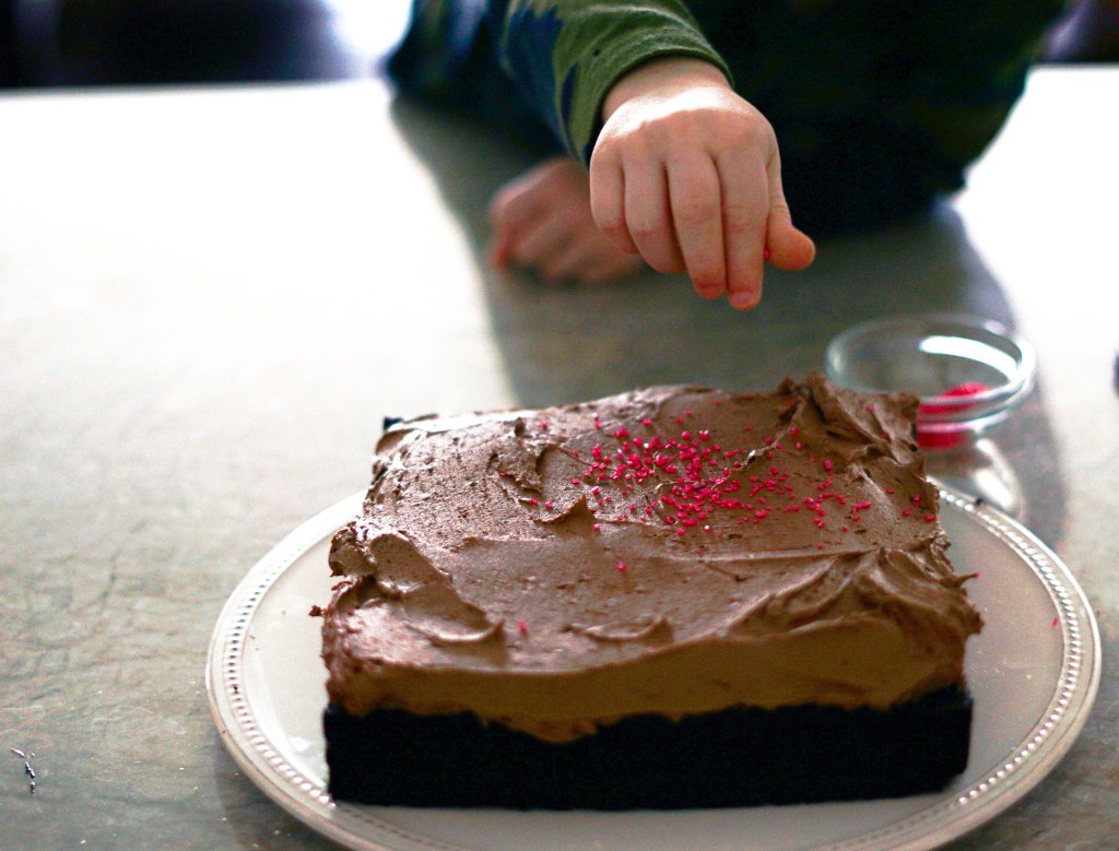 I added ALL the frosting to the top of this cake and let my sprinkle “helper” add some pink sprinkles to the top of the cake for Valentine’s Day. He for sure ate WAY MORE sprinkles than made it on the cake, but it was so fun having him help me.