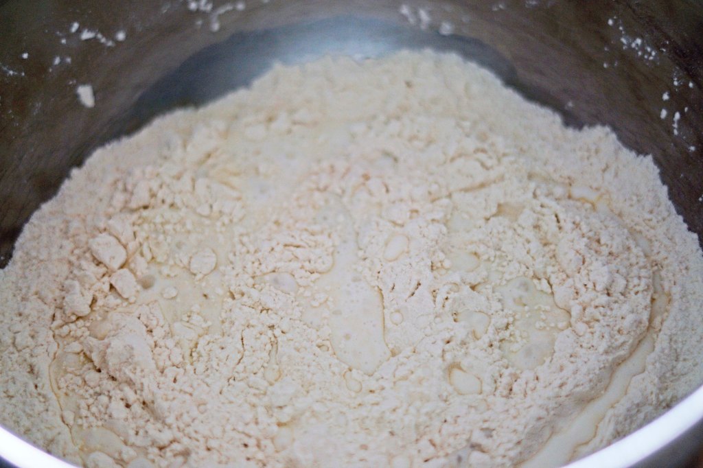 - Pour the buttermilk on top of the dry ingredients and then use a fork and mix it into the dry ingredients until the dry ingredients are all moist and just barely coming together.