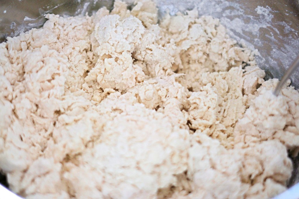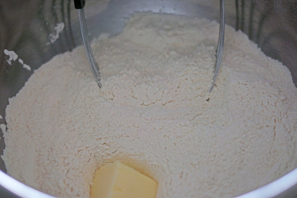 - Cut the room temperature butter into the dry ingredients until it is the size of small peas and evenly distributed into the dry ingredients.