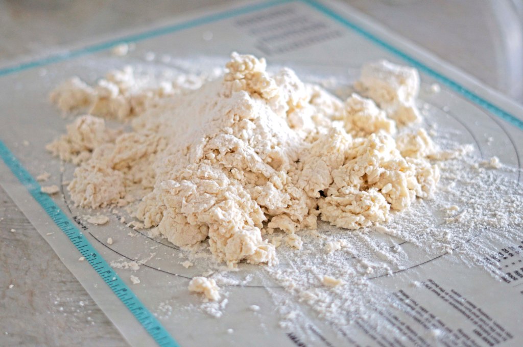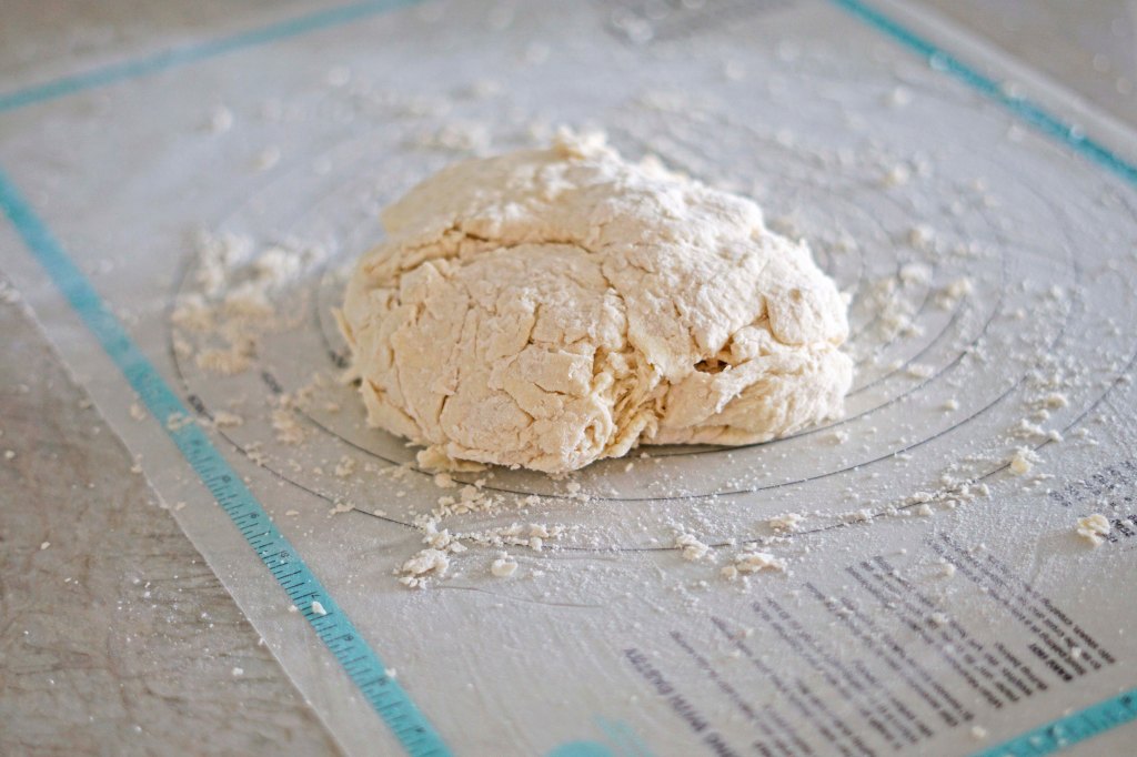 - Pour the mix onto a lightly floured surface. Fold and knead the mix together only about 12 – 15 times until the mix sticks together and can be shaped into a 6-inch-round shape. There should still be lumps and bumps and it should still look shaggy. Be sure not to over mix.