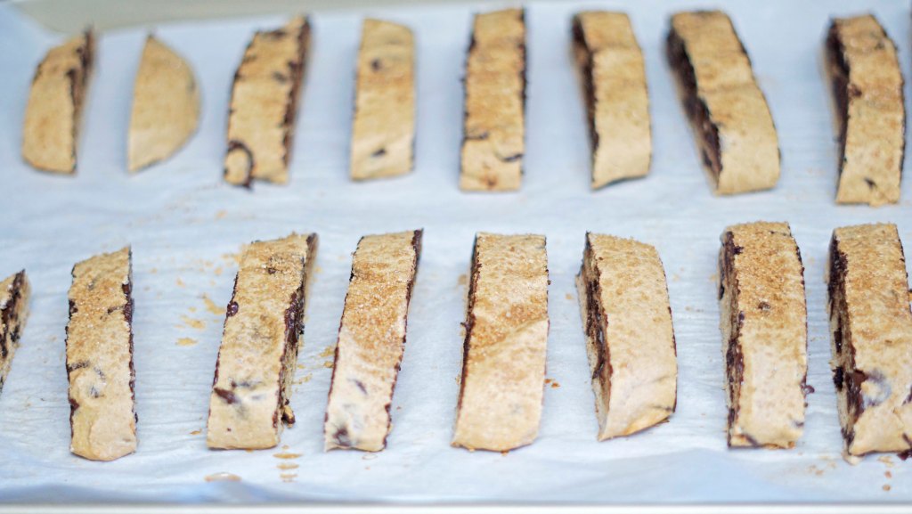 - Carefully move each log to a cutting board and spray the tops with water until they are moist. Using a serrated knife, slice each log into 3/4-inch slices. Place each slices back on the parchment lined baking sheet standing up.