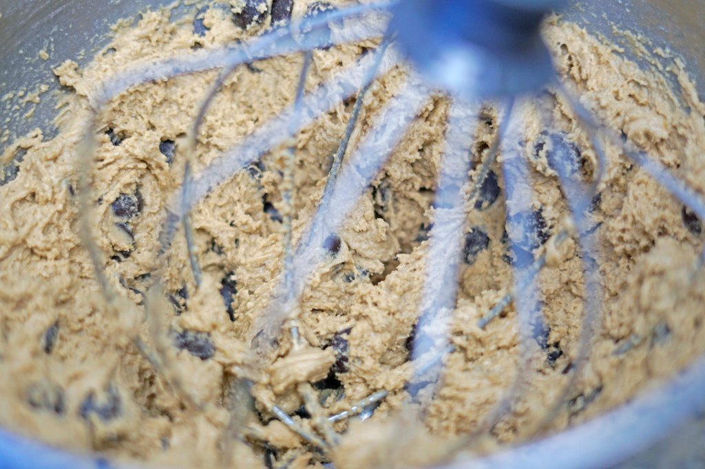 Once all the flour is incorporated, add the chocolate chips and mix until they are evenly distributed throughout the dough. It will still be really sticky at this point, but don’t worry you are all finished mixing.