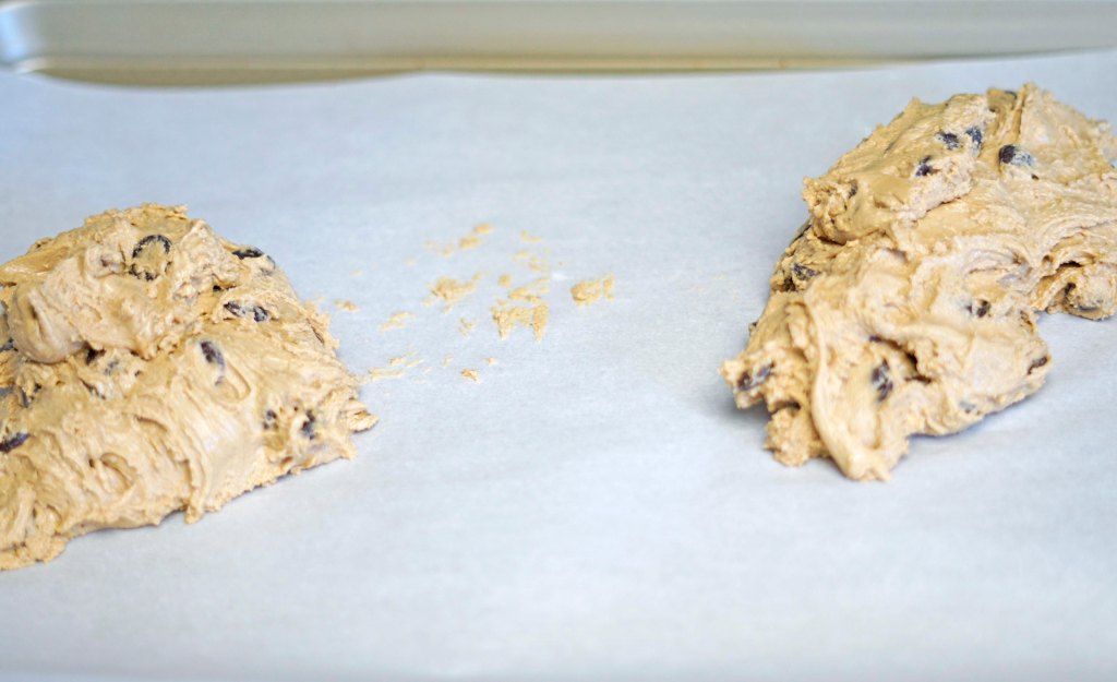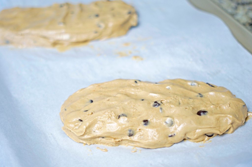 Use your spatula to scoop each half of the dough out onto the parchment lined baking sheet with some distance between them. Be as careful as possible to place the dough where you would like it the first time. Since it is so sticky, it is hard to move it once it is on the parchment paper. Then cover your hands with water and use them to shape the dough into logs about 4 inches wide and 3/4 inch high. Mine were about 10 inches long. (If forgot to grab a picture but this is when you sprinkle the turbinado sugar all over the tops) Once they are shaped, put the pan on the bottom rack of the oven and bake for 12 1/2 minutes and then take the pan out of the oven and rotate it 180 degrees. Then continue baking for 12 1/2 minutes.