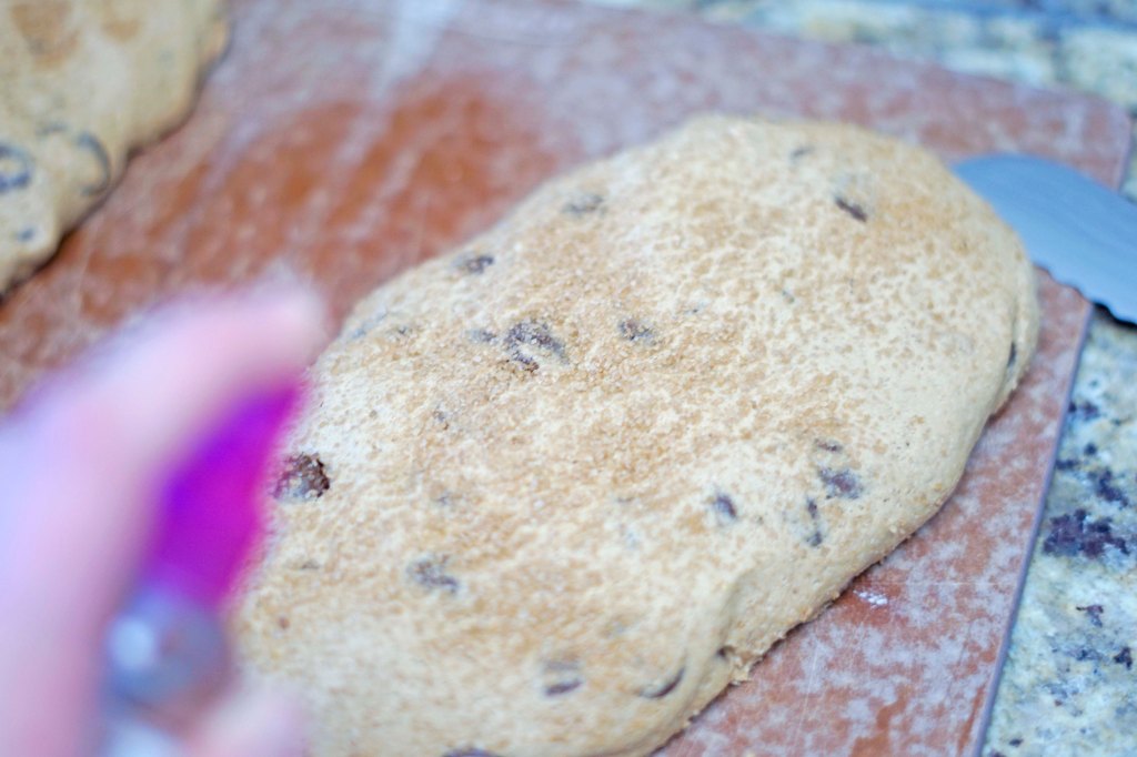 - Wet your hands generously and shape the dough into 4-inch wide by 3/4-inch tall logs (about 10-inches long). Sprinkle turbinado sugar on top of the logs and place them on the bottom rack of the oven.