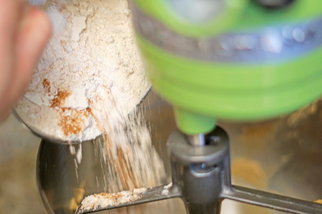Next, I added 1 tablespoon of vanilla and 1 tablespoon of corn syrup to the batter and whipped them together. After that, I mixed the flour, baking soda, salt and cinnamon together in a small bowl and then added the dry ingredients slowly to the mixture.