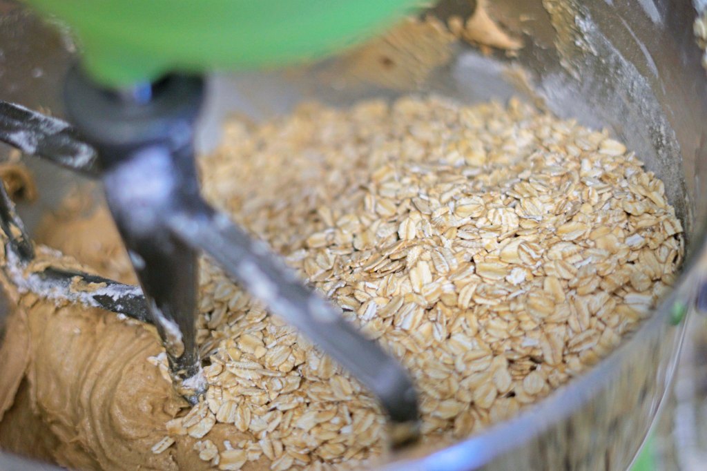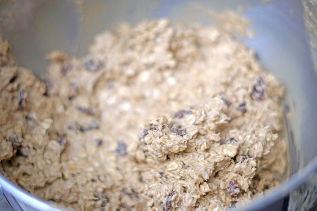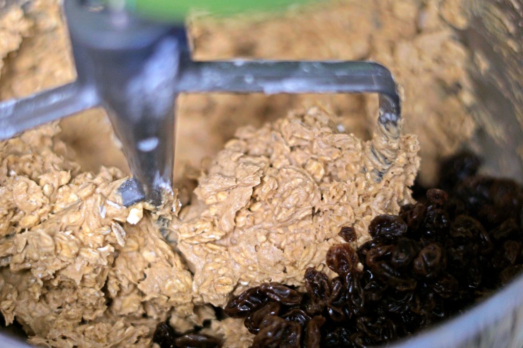 - In a small bowl, mix together the flour, baking soda, salt & cinnamon. Add the dry ingredients on low to the mixture. Once combined, scrape down the bowl and then add the oats to the bowl and mix again on low until combined. Then add the raisins and mix again on low until combined.