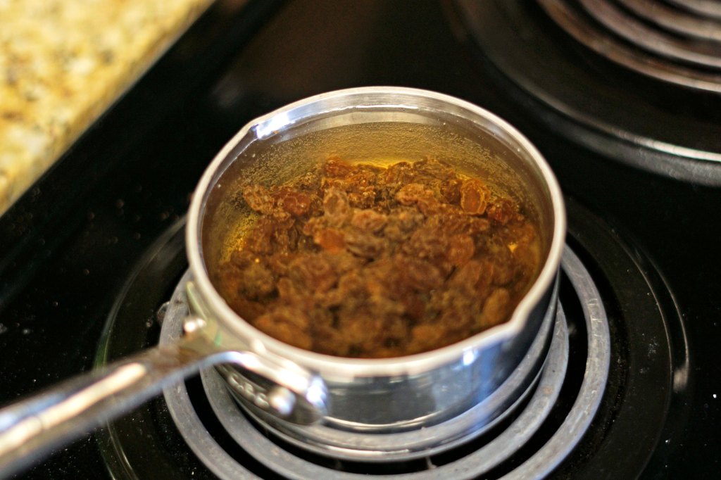 - In a small pan heat water till warm. Add bourbon to the water and then add the 1 cup of raisins. Soak for 10 minutes. Then drain and pat dry to remove as much extra moisture as possible.