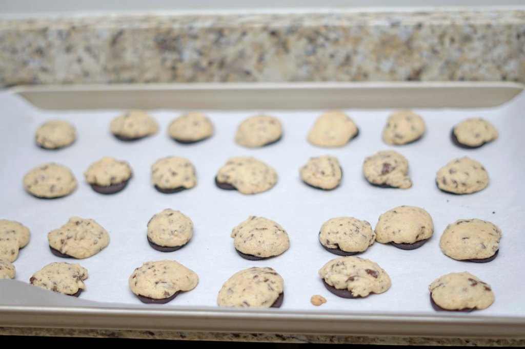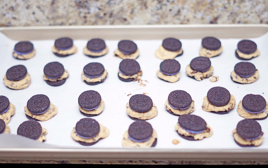 Twist the Oreos and place each of the plain sides of the cookies without cream on them on the baking sheet. Leave the other sides of the cookies to the sides until after the cookies bake. Using the smallest OXO cookie scoop – fill the scoop only half full and place the cookie dough on top of the plain Oreo side. Bake the cookies for 8 minutes.