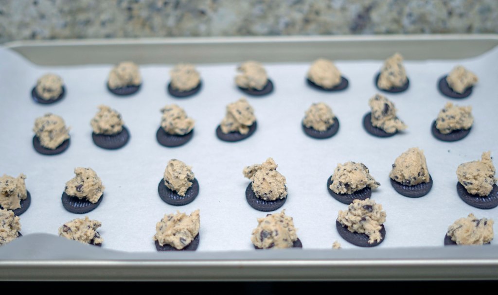 - Twist the Oreos apart and place the plain side of the Oreo on the baking sheet. Scoop a half scoop of the small OXO scoop of cookie dough and place it on top of each plain Oreo half. Bake for 8 minutes.