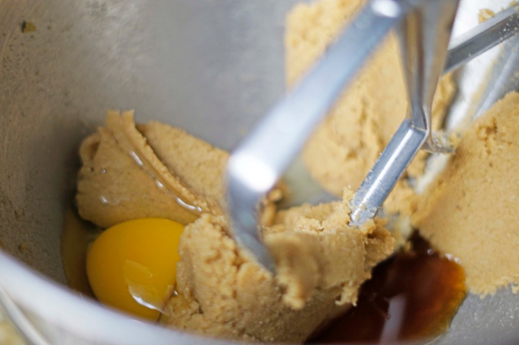 Preheat the oven to 350 F degree and line a baking sheet with parchment paper. To begin the recipe, cream the butter and sugars together in a stand mixer fitted with a paddle attachment. Then add the egg and vanilla and whip the mixture on high until the mixture is light in color and fluffy in texture.