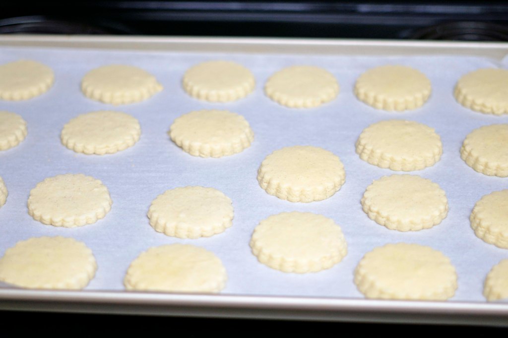 I transfer the cut cookies to the prepared baking pan with a small offset spatula in an effort to keep as much detail as possible in their shape. I put the cookies in the 325 F degree oven and checked them at 10 minutes. I was looking for them to just begin to look set, but not browned at all. The majority of my cookies were still glistening, so I let them go from another 2 minutes and then pulled them out of the oven. The second picture above is what I did with my extra dough. I used gathered up my scraps and re-rolled it between the parchment paper, then wrapped it up in the parchment, placed it on a tray that fits in my freezer, and then wrapped it in plastic wrap and put it in the freezer for a future cookie project – rolled and ready to be cut and baked!