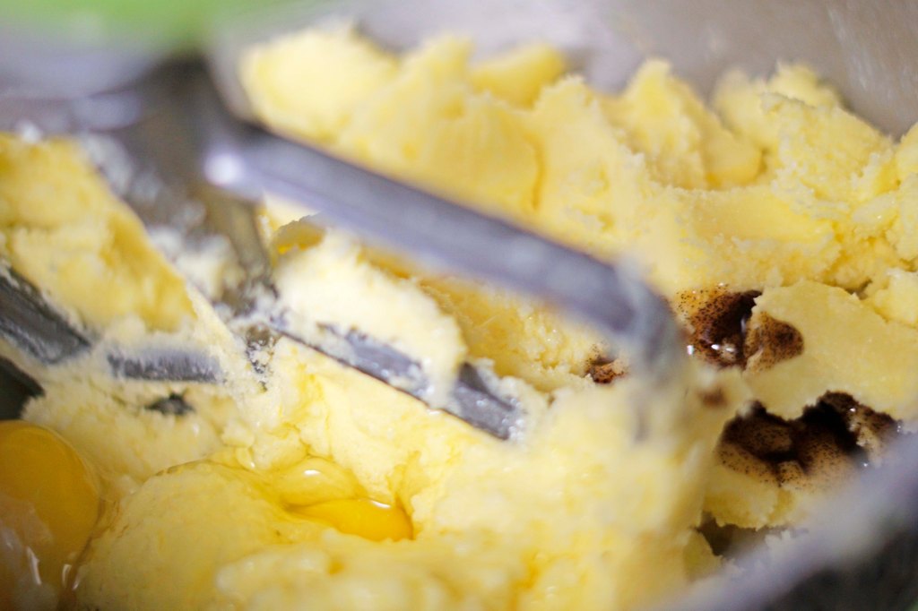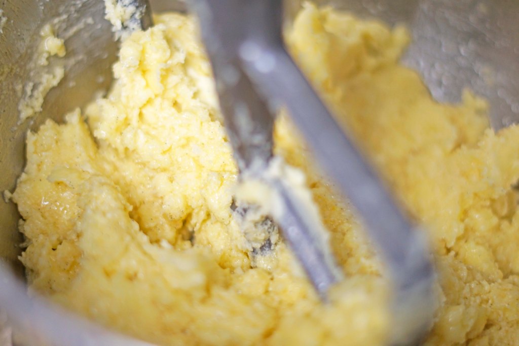 - Place butter, sugar and salt in a mixer with a paddle attachment and mix on the lowest speed until just mixed together. Scrape the sides and bottom of bowl as needed.
