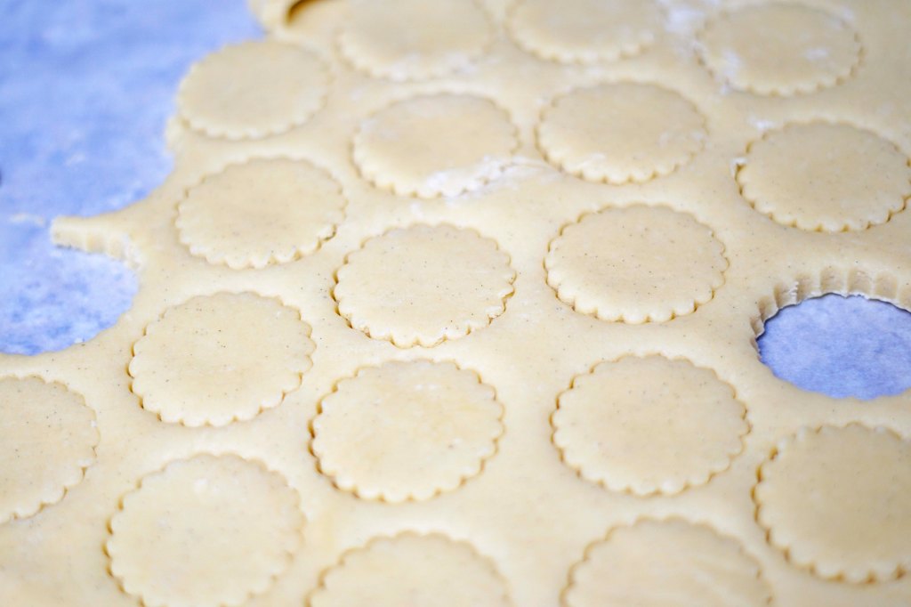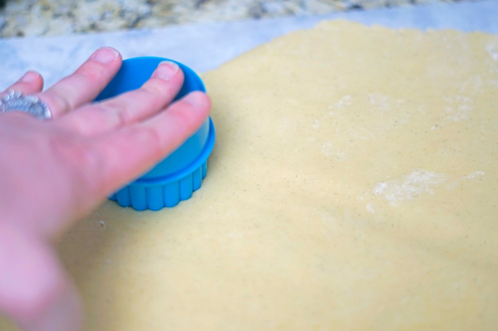 I dumped the dough out onto a piece of parchment paper and used my favorite rolling technique of rolling dough between two pieces of parchment paper to roll it out. This eliminates the need to add extra flour to your dough, and keeps everything nice and clean. I haven’t invested in a system to use when rolling out dough to make sure you have the same thickness throughout. There are several options out there – rolling pins with different thickness rubber bands on the sides or rails that you put on your counter and use your rolling pin to roll the dough out between the two rails. I would love to hear opinions of those to have used either! Since I don’t have a system though, I just rolled it until it looked thick enough to really test the “no spread” claim of this dough and used a fluted cutter because I wanted to see if the beautiful shape would hold through baking.