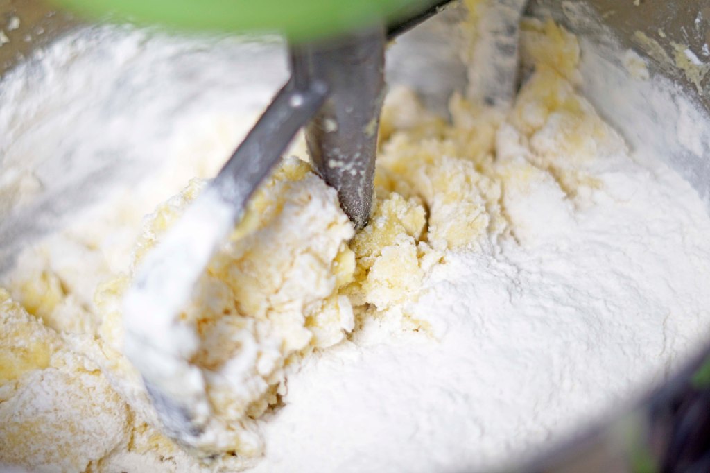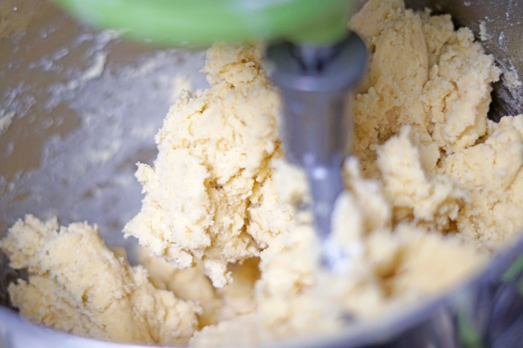 Time to bake! Preheat you oven to 325 F degrees and line a baking sheet with parchment paper to get it ready for later. Once your butter is ready add it to your stand mixer with the 2 cups of sugar and 1 teaspoon of salt (I used kosher). Then you will want to turn your mixer on the slowest speed as possible and mix the butter, sugar and salt, just until they are all incorporated. This is a big change for me, I usually cream my butter and sugar until they are super light and fluffy, but here they are just barely mixed together trying to avoid adding air to the batter. I did have to stop and scrape the bowl a few times since the speed was so low.