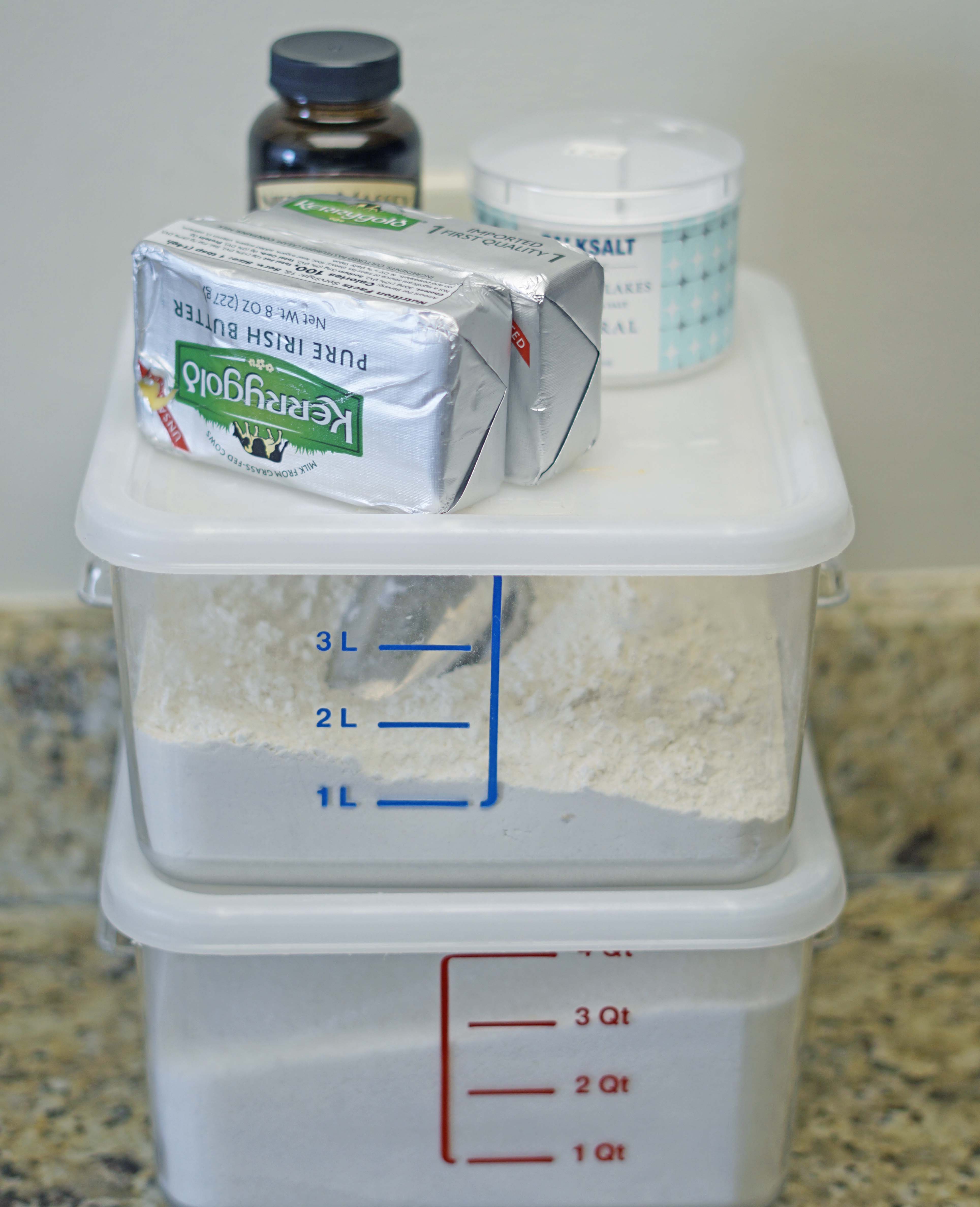 The ingredients for this recipe are super simple, but important to get accurate for desired results. The most important one is 32 tablespoons of cool unsalted butter. You also need, 2 cups of granulated sugar, 1 teaspoon salt, 2 large cold eggs, 1 tablespoon vanilla bean paste. Finally you need 6 cups of flour (scooped and leveled).