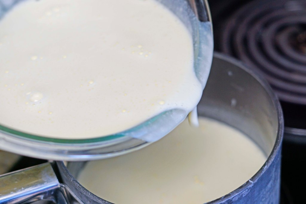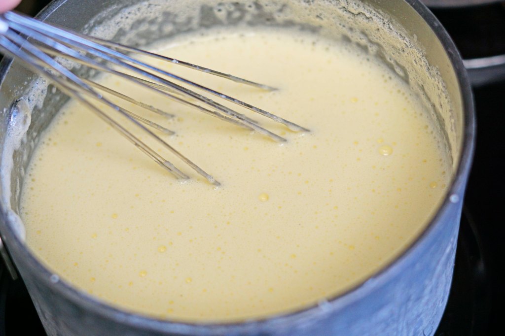 - Then add the mixture into the saucepan. Reduce heat to medium-low and continue to cook, whisking constantly, for 5 -7 minutes as the mixture thickens.