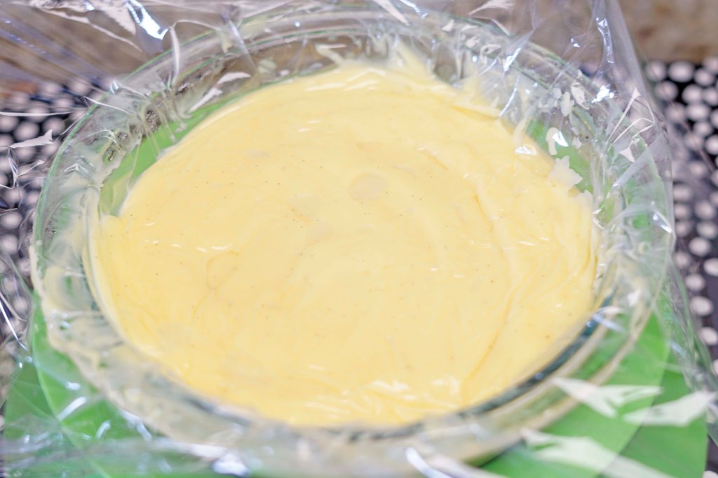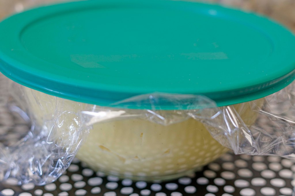 Once in the bowl, cover the entire mixture with plastic wrap. Take care to press the plastic wrap into the surface of the custard. This will keep a skin from forming on the custard while it cools. I put the lid on my container and refrigerate it until the entire mixture is cool. This can take from 2 – 4 hours, but most recipes recommend leaving it for up to 24 before using.