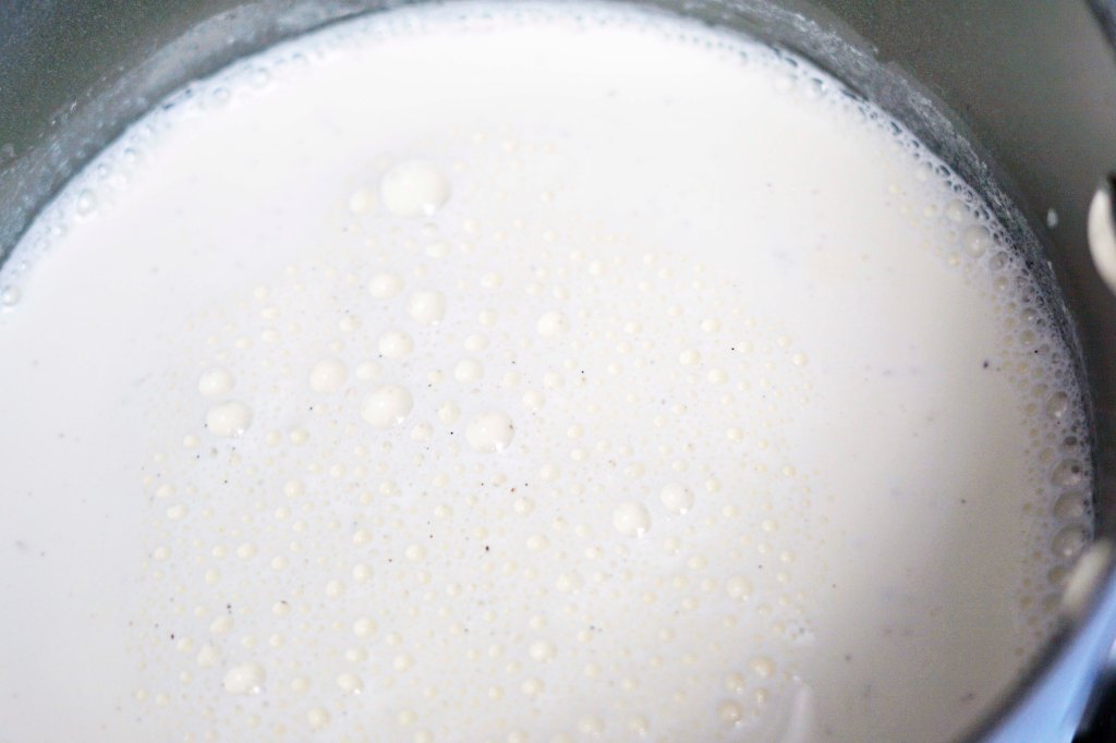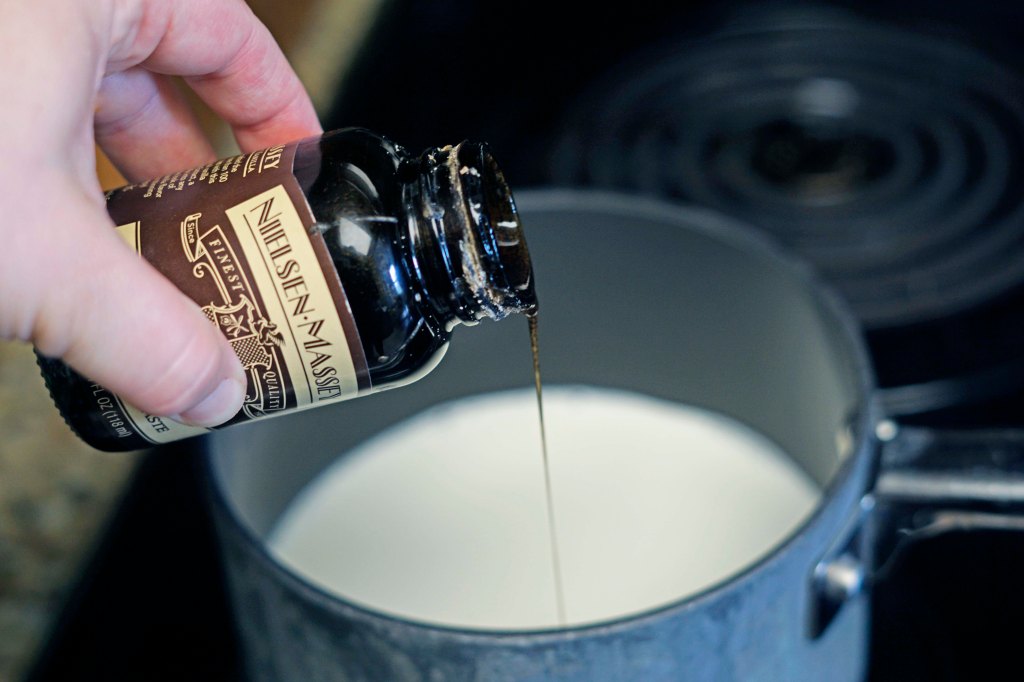 To begin, I placed my two cups of half and half on the stove over medium heat. I added a large dollop of vanilla bean paste and then whisk it all together. I let this sit on the stove over medium heat while whisking occasionally until it was steaming and right before simmering.