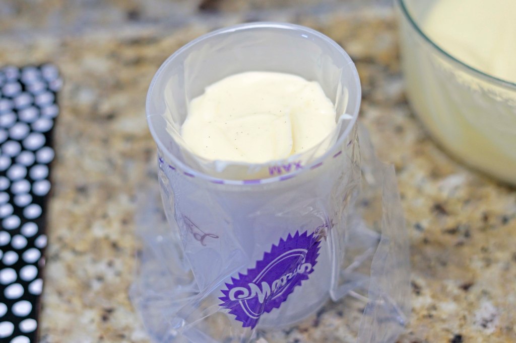 When you are ready to use your pastry cream, whisk it until it is smooth and then use it in any way you would like (eating it right out of the bowl is totally fine!) I wanted to pipe mine to make sure that it would hold its shape and I would know that it could be used to fill cream puffs in the future. I placed a star tip in a piping bag and placed my piping bag over a cup to make it easier to fill. (This picture is from my first batch which had a much lighter color than my final batch). I am sure this pastry cream would also be delicious sandwiched between two sponge cakes and topped with chocolate as it was intended in the Boston Cream Pie recipe that I found it in.
