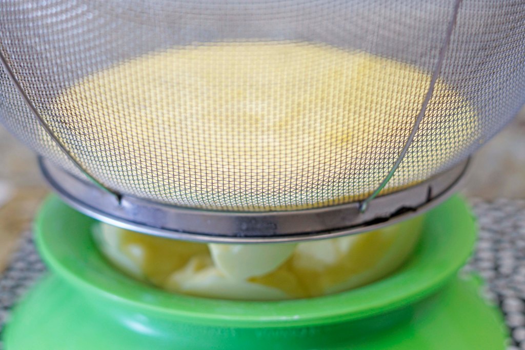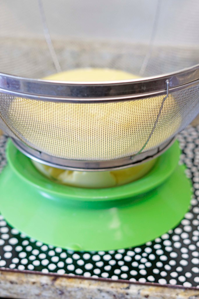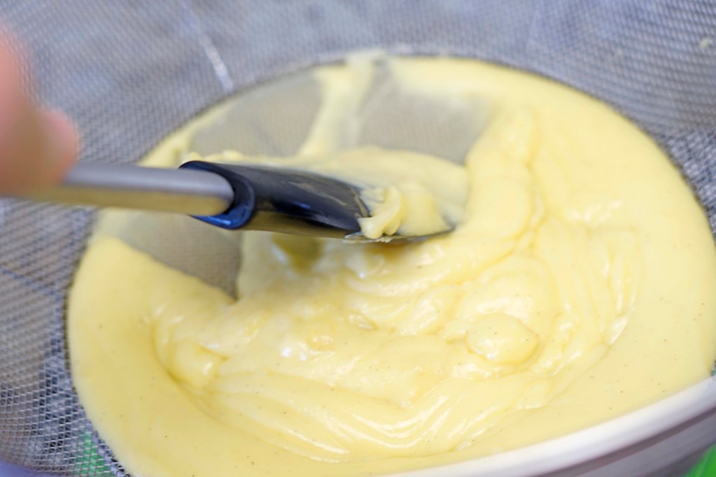 Then, pour the custard over the strainer into the smaller bowl. Use a spatula to lightly press the custard through the strainer. I like to work from the edges to the middle, not sure why, but I think it is because my strainer has a large base and I want to make sure all the custard goes into bowl. Don’t forget to scrape all the custard from the bottom of the strainer into the bowl. Any egg that overcooked and scrambled while you were cooking the custard should remain in the strainer.