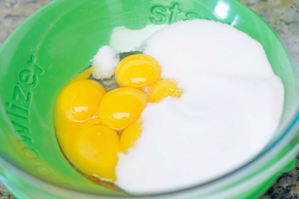 - Meanwhile, whisk egg yolks, granulated sugar, and salt together in a bowl until smooth, light in color and thickened.