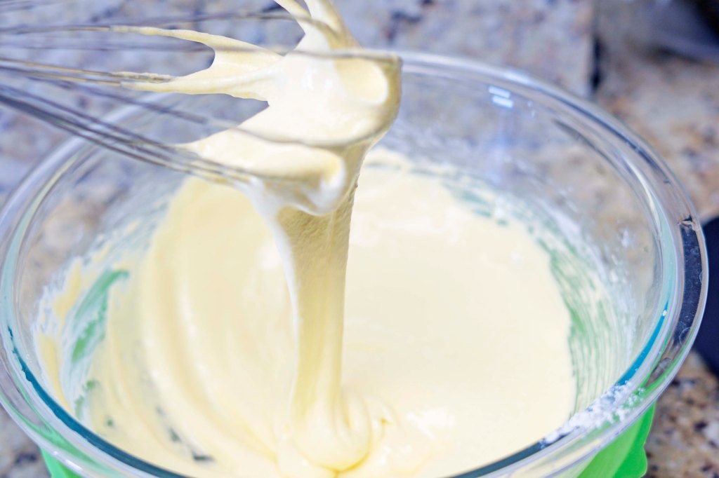 While the half and half is heating, I added the salt and sugar to the egg yolks and whisked them all together. I continued to whisk the mixture until it changed color to a light yellow. When I lifted my whisk, the mixture flowed off the like a thick ribbon, known as the ribbon stage. Next, I added my flour and whisked it first gently as not to make a mess, and then whisked it vigorously to continue to thicken the mixture and incorporate all the flour. I set my bowl on my favorite Stay-bowl-izer to help make this whole process super easy. I also used a balloon whisk while working in the bowl because the sides of the bowl are round and this whisk is perfect for reaching all the mixture and edges of the bowl.