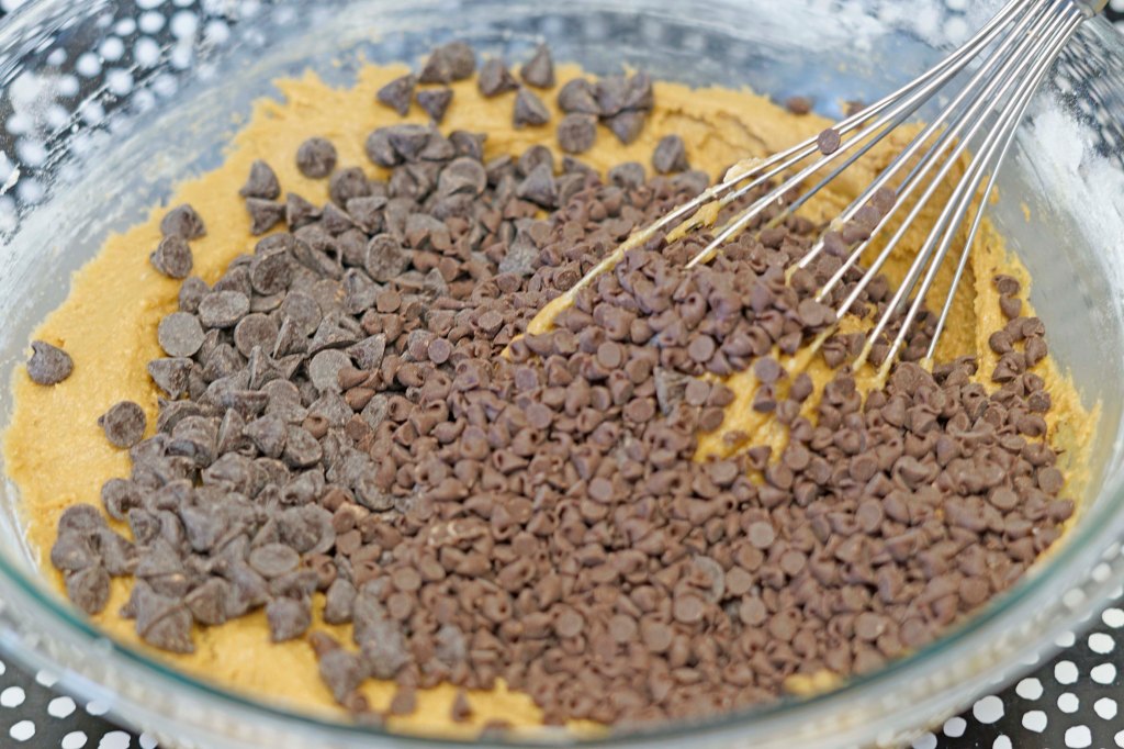 Finally the chocolate chips are added to the batter. The rich butterscotch color and smell of the melted butter batter can be seen on the left, where the softened butter batter is lighter in color with a stiffer consistency.