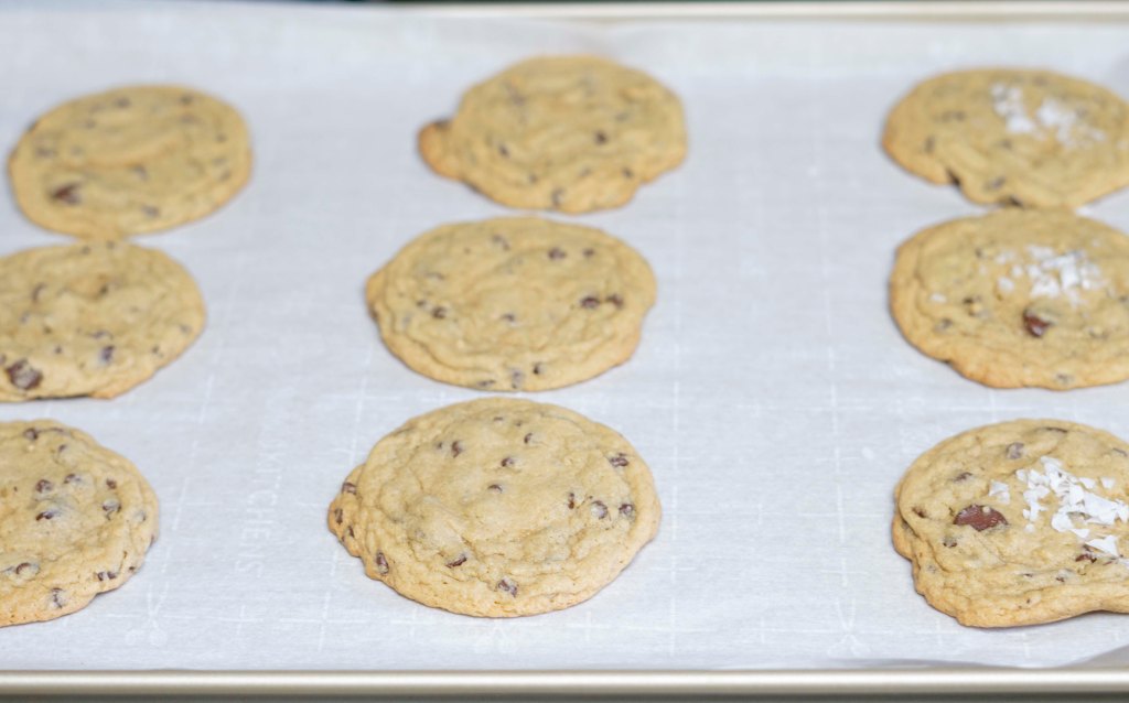 After chilling, I scooped the dough with my large OXO cookie scoop and placed them on a parchment lined baking sheet. I added some flaky sea salt to a few cookies for a slightly different texture and flavor for a few of the cookies. I am 50/50 on the results and I will probably just skip this step in the future. The cookies in the first picture were chilled for 30 minutes and then baked for 13 minutes. The second row of cookies were frozen for 2 hours and then baked for 13 minutes. Both sets of cookies taste wonderful, but they turned out super thin, fragile and very spread out.