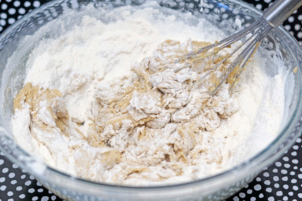 In a medium bowl, I whisked together all the dry ingredients so that they were ready to easily mix into the wet batter. The first time I made this recipe I fluffed, scooped and leveled the flour. The second time, I scooped the flour right from the container and I think this provided a more appropriate amount of flour for this cookie. The addition of the corn starch in this recipe helps keep these cookies soft and tender. As you can see in the first picture with the melted butter it was much easier to mix in the dry ingredients into the melted butter batter than the softened butter batter.